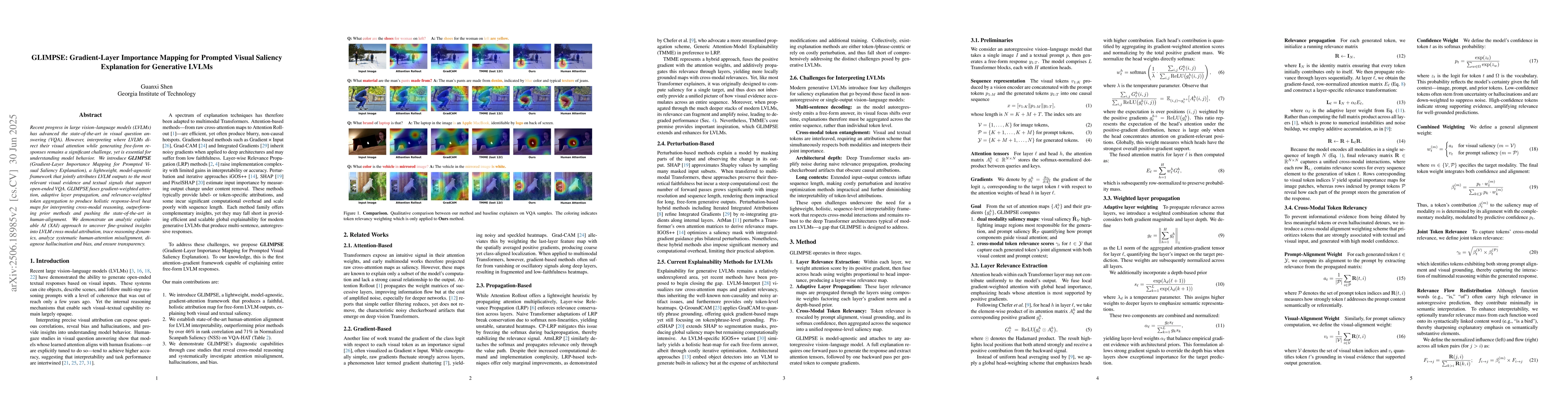 Recent advances in large vision language models (LVLMs) have unlocked unprecedented capabilities in generating coherent responses from visual inputs. However, interpreting where LVLMs direct their visual attention while generating free-form textual responses remains a significant challenge, yet is essential for understanding model behavior, diagnosing hallucination, exposing bias and ensuring transparency. We introduce GLIMPSE (Gradient-Layer Importance Mapping for Prompted Visual Saliency Explanation), a lightweight, model-agnostic framework for visualizing the salient image regions that LVLMs rely upon during open-ended visual question answering (VQA), while concurrently revealing the multimodal textual saliency. GLIMPSE fuses gradient-weighted attention, adaptive layer propagation, and weighted token aggregation to produce holistic response-level attribution heat maps for interpreting cross-modal reasoning, outperforming prior interpretability methods in human-alignment. We demonstrate an analytic explainable AI (XAI) approach using GLIMPSE to uncover fine-grained insights into LVLM cross-modal attribution, trace token-level reasoning dynamics, and analyze systematic human-attention misalignment, hallucination, and bias.