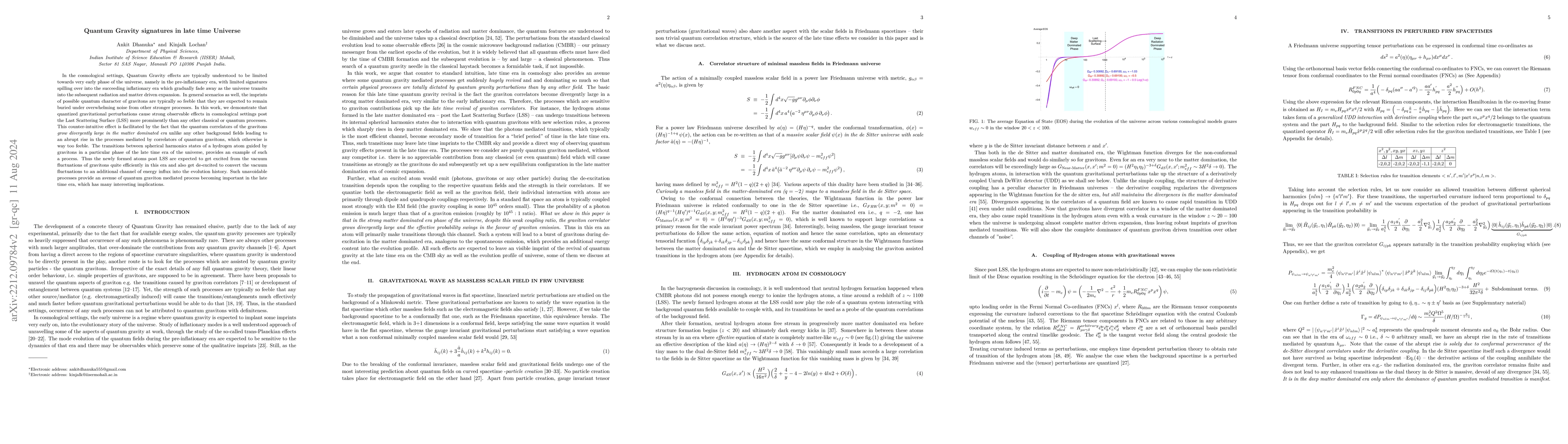 In the cosmological settings, Quantum Gravity effects are typically understood to be limited towards very early phase of the universe, namely in the pre-inflationary era, with limited signatures remaining present in the succeeding inflationary era. These signatures also gradually fade away as the universe grows and exits the inflationary era. In the subsequent radiation and matter dominated era quantum gravity is expected to play no significant role. Classicalized primordial perturbations such as the scalar perturbations and the gravitational waves are expected to leave an imprint on CMB anisotropy and its polarization respectively but quantized gravitational waves are not expected to lead to any appreciable observable effects. Apart from cosmology, in other avenues as well, the imprints of quantum character of gravitational waves are typically so subdued that any possible signature gets buried under a huge pile of the noise or effects from other much stronger processes. In this work, we demonstrate that quantum gravity perturbations cause strong observable effects in cosmological settings post the Last Scattering Surface (LSS) more prominently than any other classical or quantum processes. This counter-intuitive effect is facilitated by the fact that the correlators of the gravitational waves {\it grow divergently large in the matter dominated era} unlike any other background fields, leading to an abrupt rise in the processes mediated by correlators of quantum gravitons. The transitions between spherical harmonics states of newly formed hydrogen atom at the LSS, when the universe resides in strong matter dominated era, provides an example of such a process. We further establish that the late time epoch just before the kicking in of the dark energy provides one of the cleanest avenues to study such quantum gravity effects.