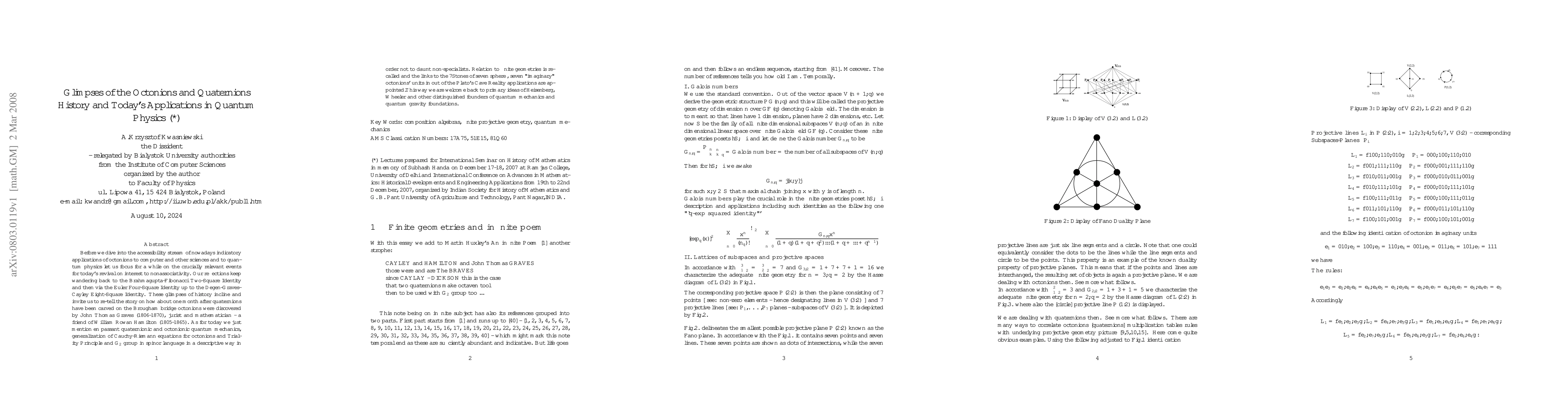 This paper explores the history of octonions and quaternions in quantum physics, tracing their development from ancient Indian and European mathematicians to modern applications in finite geometries and quantum mechanics.