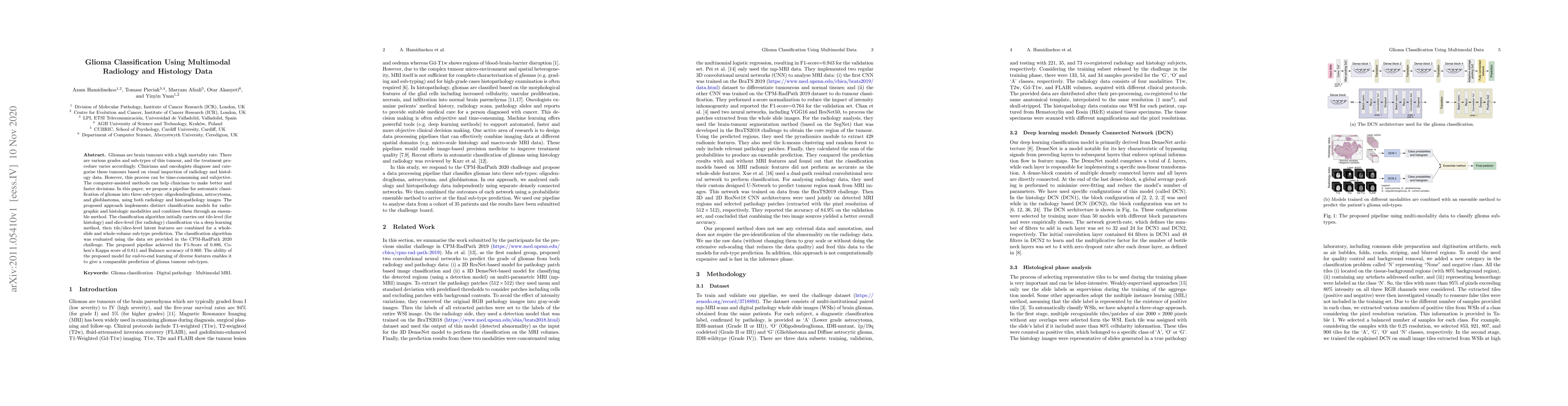 Gliomas are brain tumours with a high mortality rate. There are various grades and sub-types of this tumour, and the treatment procedure varies accordingly. Clinicians and oncologists diagnose and categorise these tumours based on visual inspection of radiology and histology data. However, this process can be time-consuming and subjective. The computer-assisted methods can help clinicians to make better and faster decisions. In this paper, we propose a pipeline for automatic classification of gliomas into three sub-types: oligodendroglioma, astrocytoma, and glioblastoma, using both radiology and histopathology images. The proposed approach implements distinct classification models for radiographic and histologic modalities and combines them through an ensemble method. The classification algorithm initially carries out tile-level (for histology) and slice-level (for radiology) classification via a deep learning method, then tile/slice-level latent features are combined for a whole-slide and whole-volume sub-type prediction. The classification algorithm was evaluated using the data set provided in the CPM-RadPath 2020 challenge. The proposed pipeline achieved the F1-Score of 0.886, Cohen's Kappa score of 0.811 and Balance accuracy of 0.860. The ability of the proposed model for end-to-end learning of diverse features enables it to give a comparable prediction of glioma tumour sub-types.