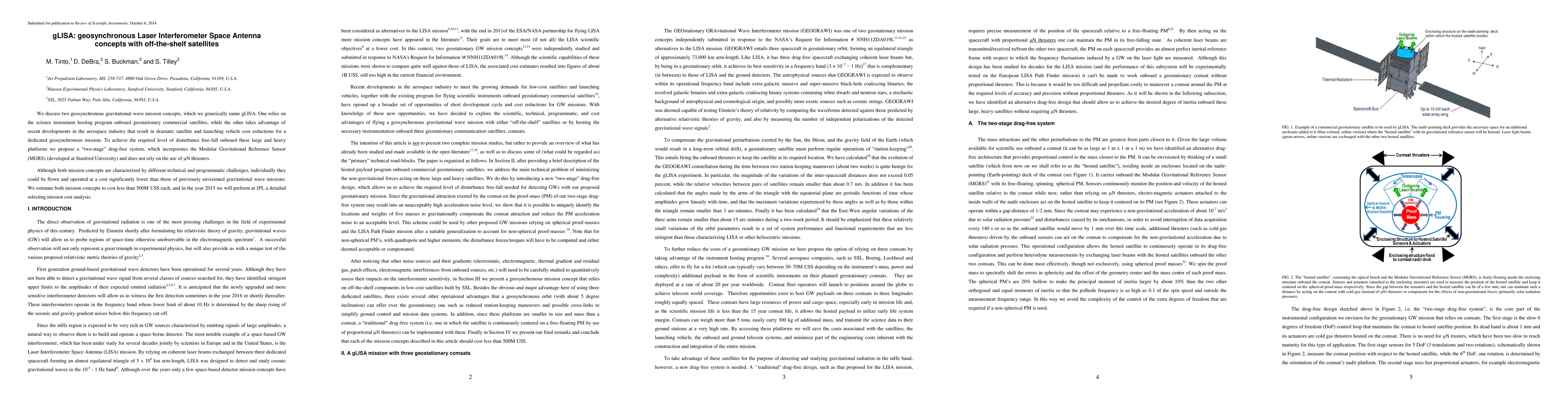 Two geosynchronous gravitational wave mission concepts, gLISA, aim to detect cosmic waves at a significantly lower cost than previous missions. Both concepts estimate costs under $500M each and will undergo a detailed cost analysis in 2015.