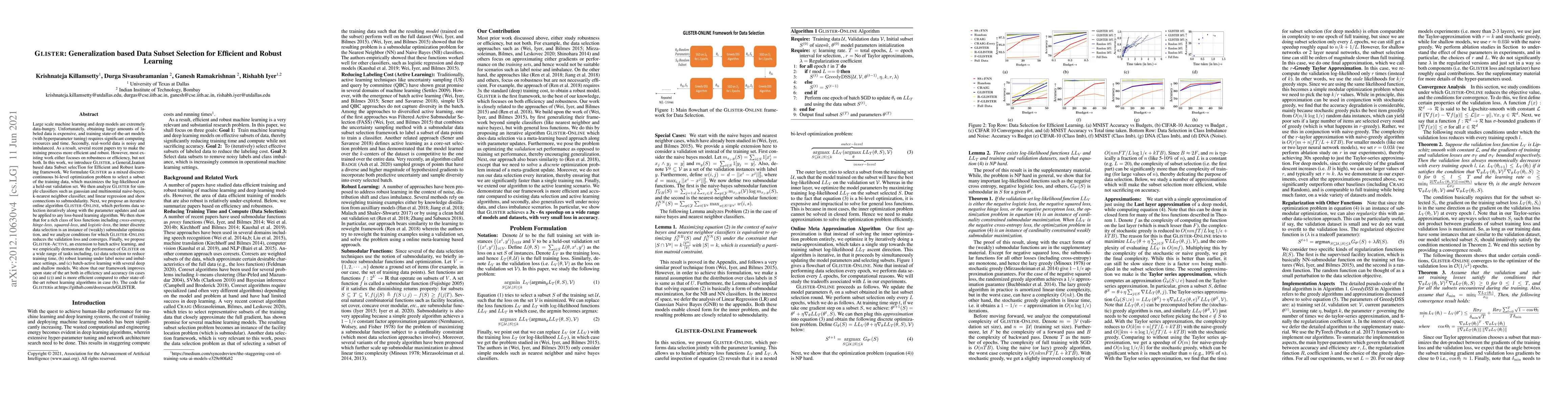 Glister is a framework for efficient and robust learning by selecting optimal data subsets, addressing both efficiency and robustness in training large-scale models. It employs a mixed discrete-continuous bi-level optimization and an iterative online algorithm for adaptive data selection, demonstrating improved performance in training time reduction, robust learning under noise, and active learning.