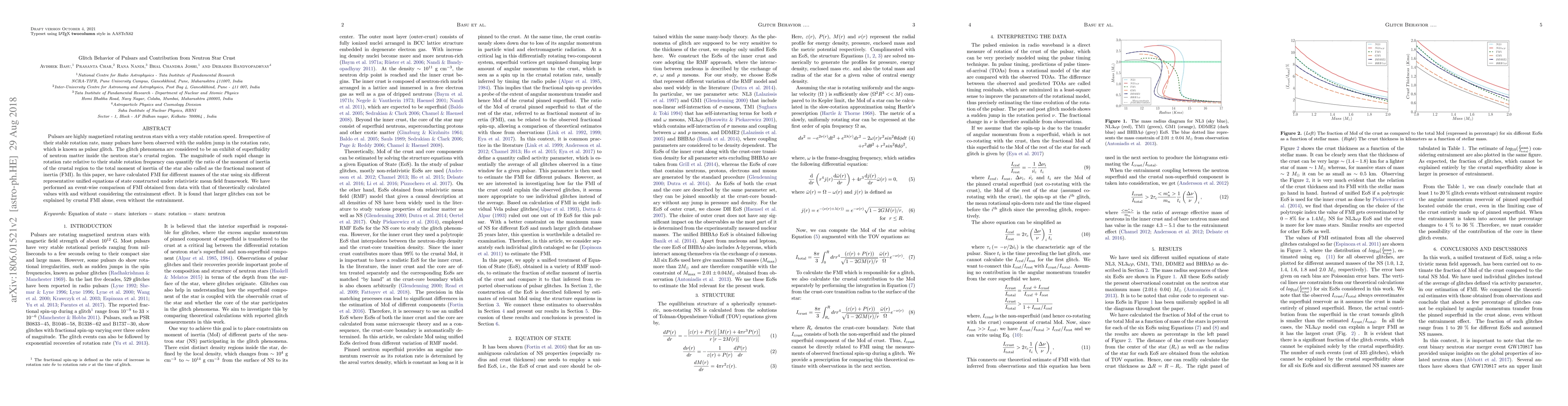 This paper investigates pulsar glitches, sudden jumps in rotation rate, and their relation to neutron star crustal properties. It calculates fractional moment of inertia (FMI) for different neutron star masses using various unified equations of state, finding that larger glitches cannot be solely explained by crustal FMI.