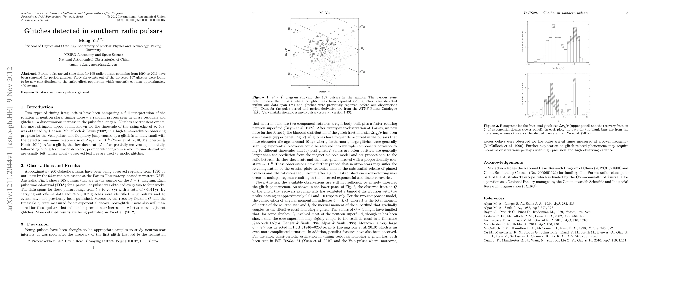 This study analyzed Parkes radio telescope data from 1990 to 2011 for 165 southern radio pulsars, identifying 107 glitches, of which 46 were newly detected events contributing to the existing population of approximately 400 glitches.