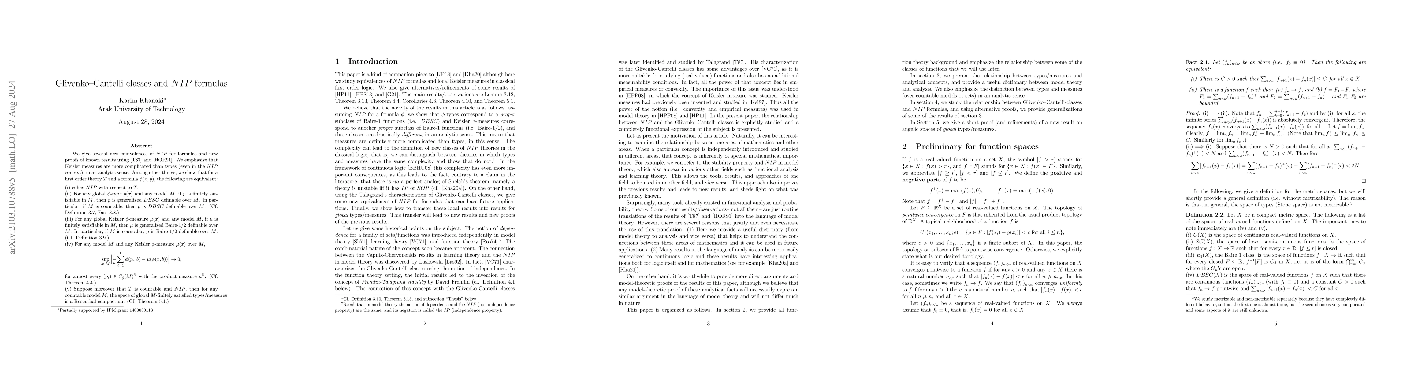 This paper establishes new equivalences for the NIP property in first-order logic, showing that it is equivalent to various conditions involving the definability of global types and measures over models. It also highlights the complexity of Keisler measures compared to types in the NIP context.
