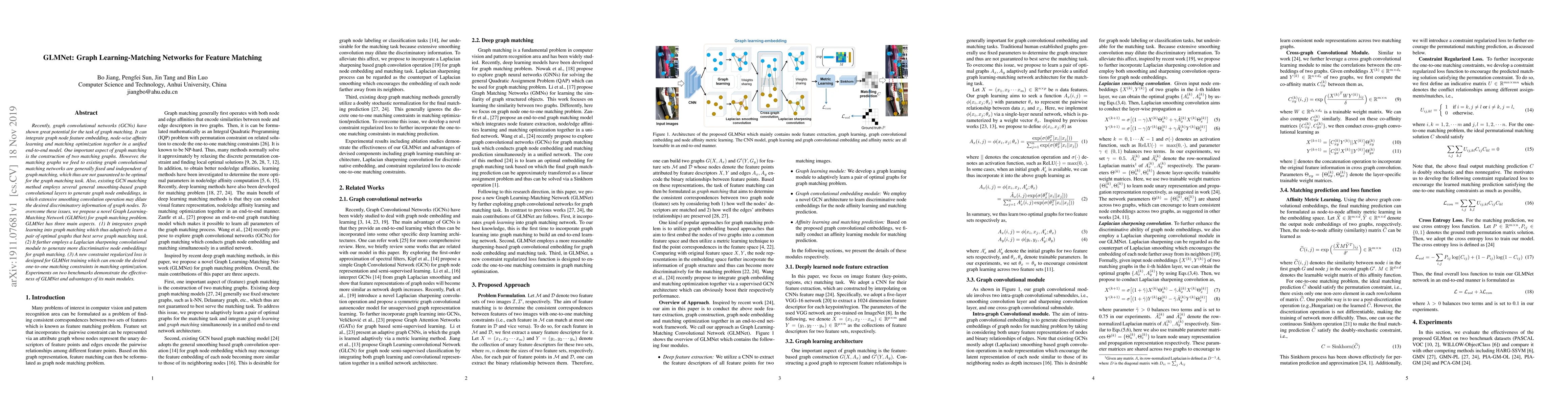 GLMNet proposes a novel Graph Learning-Matching Network to enhance graph matching by adaptively learning optimal matching graphs and employing Laplacian sharpening convolution for discriminative node embeddings, along with a constraint regularized loss for one-to-one matching constraints. Experiments show its effectiveness over existing methods.
