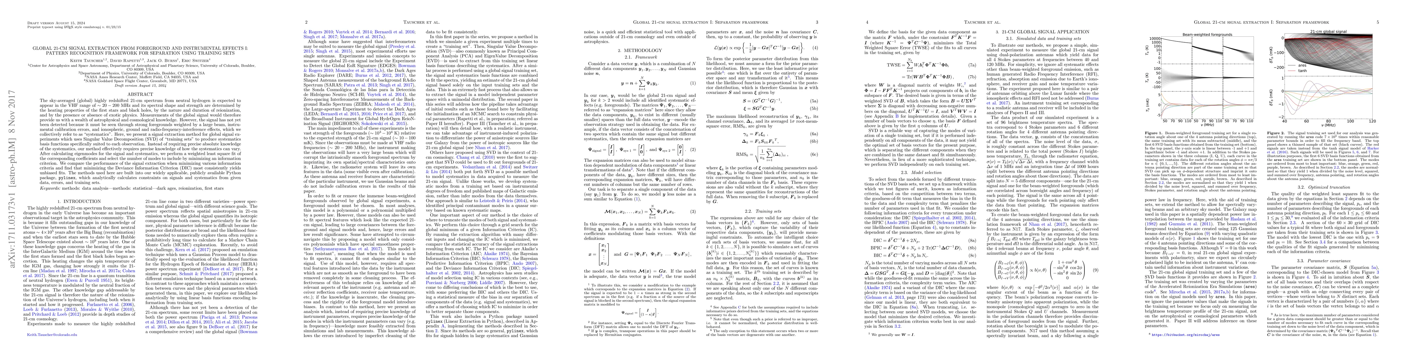 The sky-averaged (global) highly redshifted 21-cm spectrum from neutral hydrogen is expected to appear in the VHF range of $\sim20-200$ MHz and its spectral shape and strength are determined by the heating properties of the first stars and black holes, by the nature and duration of reionization, and by the presence or absence of exotic physics. Measurements of the global signal would therefore provide us with a wealth of astrophysical and cosmological knowledge. However, the signal has not yet been detected because it must be seen through strong foregrounds weighted by a large beam, instrumental calibration errors, and ionospheric, ground and radio-frequency-interference effects, which we collectively refer to as "systematics". Here, we present a signal extraction method for global signal experiments which uses Singular Value Decomposition (SVD) of "training sets" to produce systematics basis functions specifically suited to each observation. Instead of requiring precise absolute knowledge of the systematics, our method effectively requires precise knowledge of how the systematics can vary. After calculating eigenmodes for the signal and systematics, we perform a weighted least square fit of the corresponding coefficients and select the number of modes to include by minimizing an information criterion. We compare the performance of the signal extraction when minimizing various information criteria and find that minimizing the Deviance Information Criterion (DIC) most consistently yields unbiased fits. The methods used here are built into our widely applicable, publicly available Python package, $\texttt{pylinex}$, which analytically calculates constraints on signals and systematics from given data, errors, and training sets.