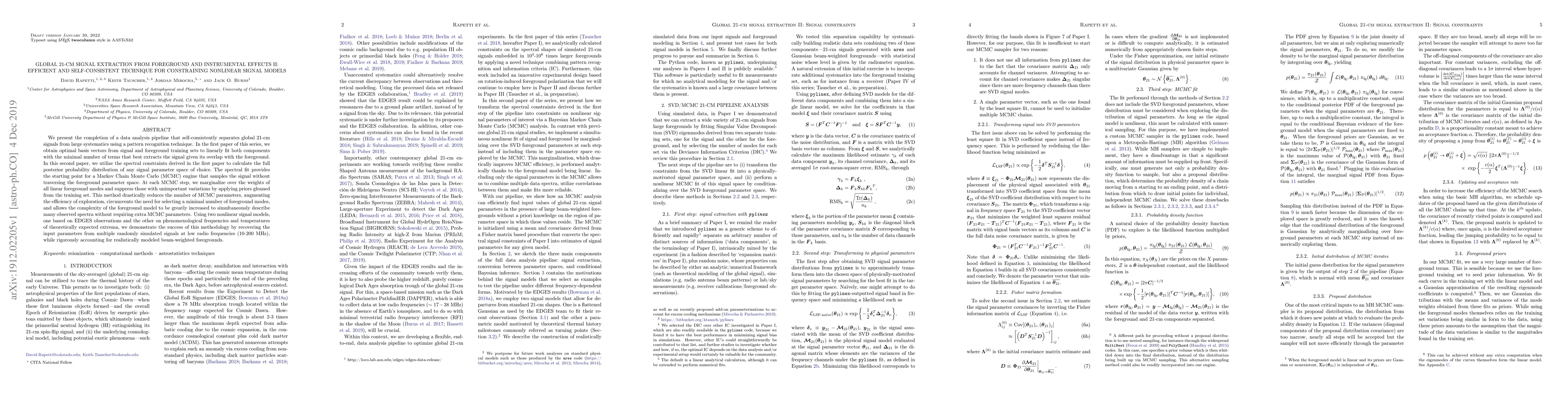 We present the completion of a data analysis pipeline that self-consistently separates global 21-cm signals from large systematics using a pattern recognition technique. In the first paper of this series, we obtain optimal basis vectors from signal and foreground training sets to linearly fit both components with the minimal number of terms that best extracts the signal given its overlap with the foreground. In this second paper, we utilize the spectral constraints derived in the first paper to calculate the full posterior probability distribution of any signal parameter space of choice. The spectral fit provides the starting point for a Markov Chain Monte Carlo (MCMC) engine that samples the signal without traversing the foreground parameter space. At each MCMC step, we marginalize over the weights of all linear foreground modes and suppress those with unimportant variations by applying priors gleaned from the training set. This method drastically reduces the number of MCMC parameters, augmenting the efficiency of exploration, circumvents the need for selecting a minimal number of foreground modes, and allows the complexity of the foreground model to be greatly increased to simultaneously describe many observed spectra without requiring extra MCMC parameters. Using two nonlinear signal models, one based on EDGES observations and the other on phenomenological frequencies and temperatures of theoretically expected extrema, we demonstrate the success of this methodology by recovering the input parameters from multiple randomly simulated signals at low radio frequencies (10-200 MHz), while rigorously accounting for realistically modeled beam-weighted foregrounds.