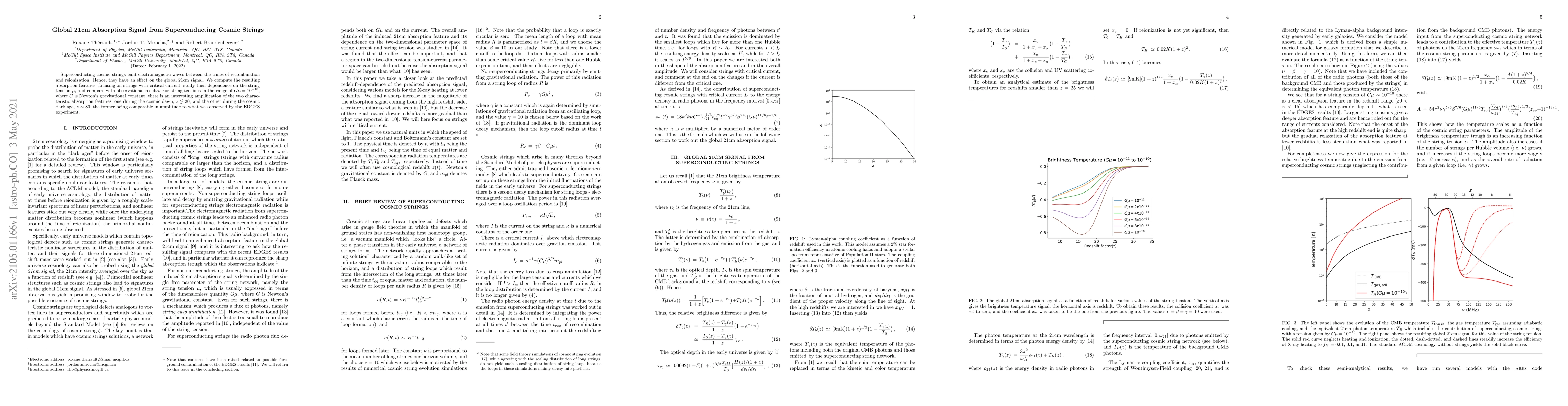 Research finds that superconducting cosmic strings can amplify two absorption features in the global 21cm signal, with characteristics observed during the cosmic dawn and dark age, comparable to EDGES experiment results.