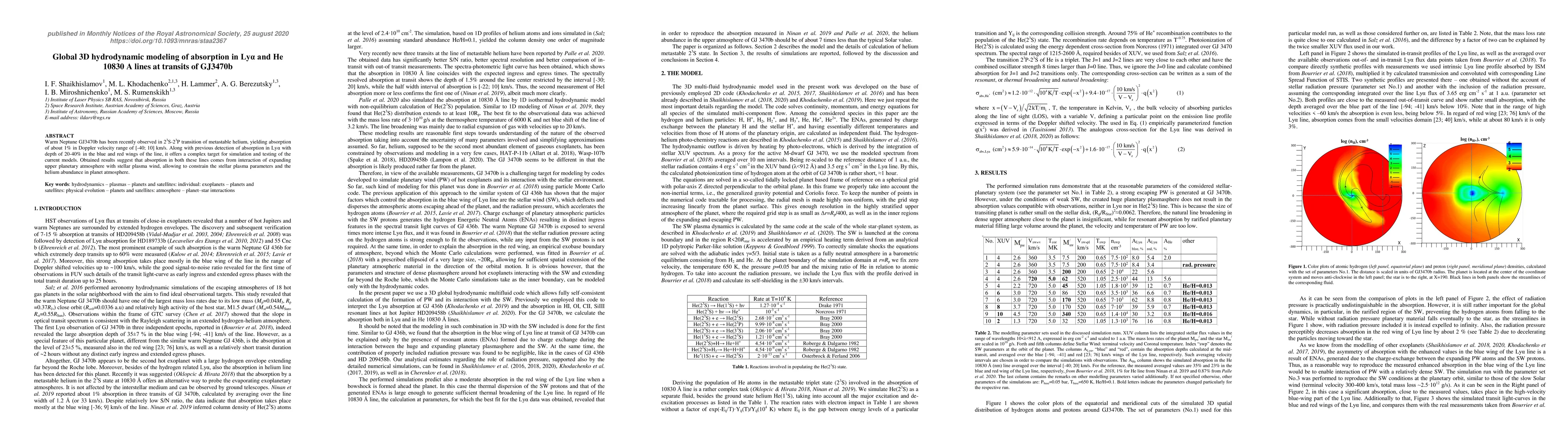 Researchers modeled absorption in Ly{eta} and He I 10830 lines from GJ3470b, attributing it to interaction between the planet's atmosphere and stellar plasma wind, providing insights into helium abundance and stellar plasma parameters.