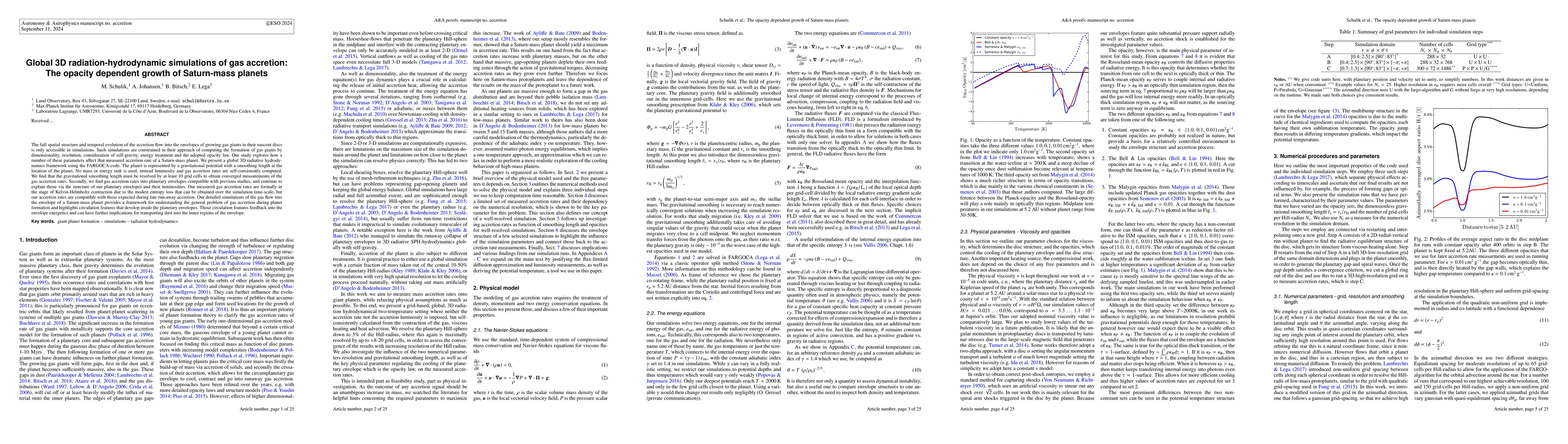 The full spatial structure and temporal evolution of the accretion flow into the envelopes of growing gas giants in their nascent discs is only accessible in simulations. Such simulations are constrained in their approach of computing the formation of gas giants by dimensionality, resolution, consideration of self-gravity, energy treatment and the adopted opacity law. Our study explores how a number of these parameters affect that measured accretion rate of a Saturn-mass planet. We present a global 3D radiative hydrodynamics framework using the FARGOCA-code. The planet is represented by a gravitational potential with a smoothing length at the location of the planet. No mass or energy sink is used, instead luminosity and gas accretion rates are self-consistently computed. We find that the gravitational smoothing length must be resolved by at least 10 grid cells to obtain converged measurements of the gas accretion rates. Secondly, we find gas accretion rates into planetary envelopes compatible with previous studies, and continue to explain those via the structure of our planetary envelopes and their luminosities. Our measured gas accretion rates are formally in the stage of Kelvin-Helmholtz contraction due to the modest entropy loss that can be obtained over the simulation time-scale, but our accretion rates are compatible with those expected during late run-away accretion. Our detailed simulations of the gas flow into the envelope of a Saturn-mass planet provides a framework for understanding the general problem of gas accretion during planet formation and highlights circulation features that develop inside the planetary envelopes. Those circulation features feedback into the envelope energetics and can have further implications for transporting dust into the inner regions of the envelope.