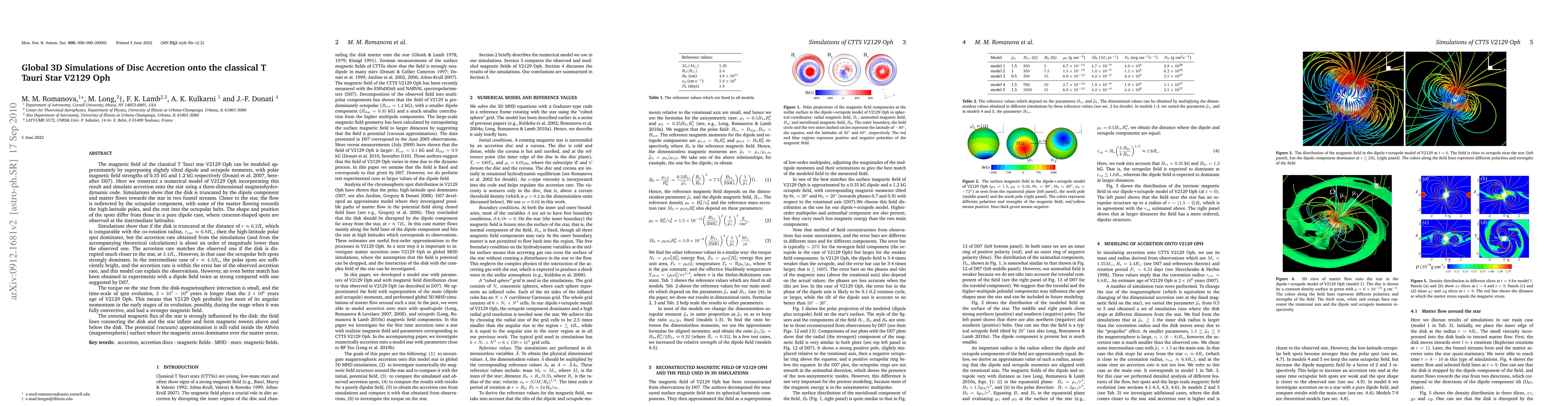 This paper models the accretion process onto the classical T Tauri star V2129 Oph using global 3D simulations, showing that the star's magnetic field, composed of dipole and octupole components, truncates the accretion disk and directs matter flow into funnel streams and octupolar belts. The study finds that while the disk truncated at 6.2 R_* aligns with the co-rotation radius, it results in a much lower accretion rate than observed, suggesting a closer truncation at 3.4 R_* for better match.