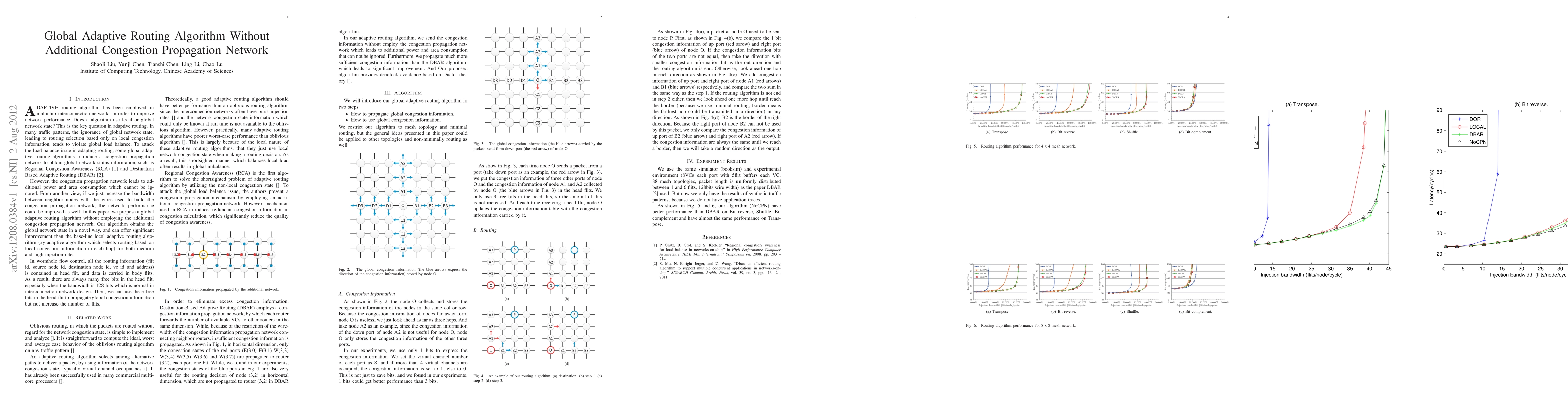 Adaptive routing algorithm has been employed in multichip interconnection networks in order to improve network performance. Does a algorithm use local or global network state? This is the key question in adaptive routing. In many traffic patterns, the ignorance of global network state, leading to routing selection based only on local congestion information, tends to violate global load balance. To attack the load balance issue in adapting routing, some global adaptive routing algorithms introduce a congestion propagation network to obtain global network status information, such as Regional Congestion Awareness (RCA) and Destination Based Adaptive Routing (DBAR). However, the congestion propagation network leads to additional power and area consumption which cannot be ignored. From another view, if we just increase the bandwidth between neighbor nodes with the wires used to build the congestion propagation network, the network performance could be improved as well. In this paper, we propose a global adaptive routing algorithm without employing the additional congestion propagation network. Our algorithm obtains the global network state in a novel way, and can offer significant improvement than the base-line local adaptive routing algorithm (xy-adaptive algorithm which selects routing based on local congestion information in each hop) for both medium and high injection rates. In wormhole flow control, all the routing information (flit id, source node id, destination node id, vc id and address) is contained in head flit, and data is carried in body flits. As a result, there are always many free bits in the head flit, especially when the bandwidth is 128-bits which is normal in interconnection network design. Then, we can use these free bits in the head flit to propagate global congestion information but not increase the number of flits.