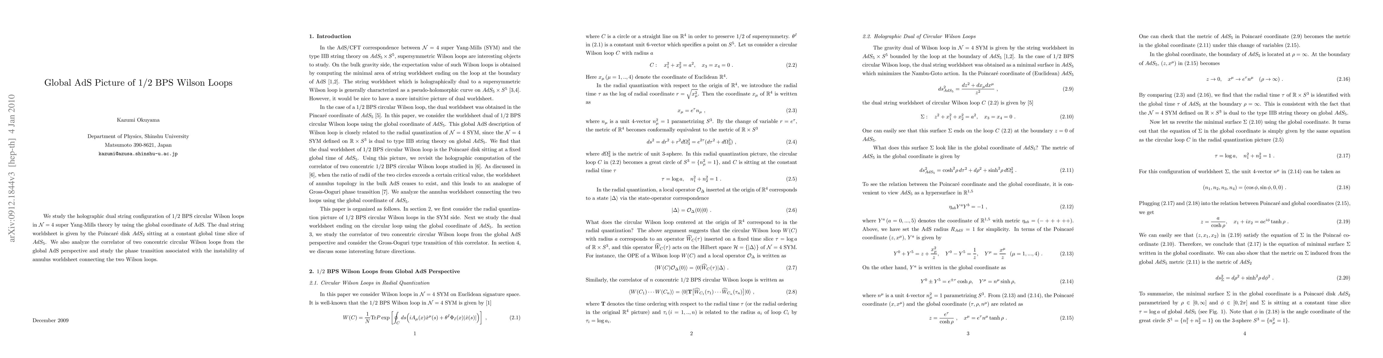 This paper explores the holographic dual of 1/2 BPS circular Wilson loops in N=4 super Yang-Mills theory using global AdS coordinates, identifying the dual string worldsheet as a Poincare disk AdS_2. It also investigates the correlator and phase transition of two concentric Wilson loops in global AdS.