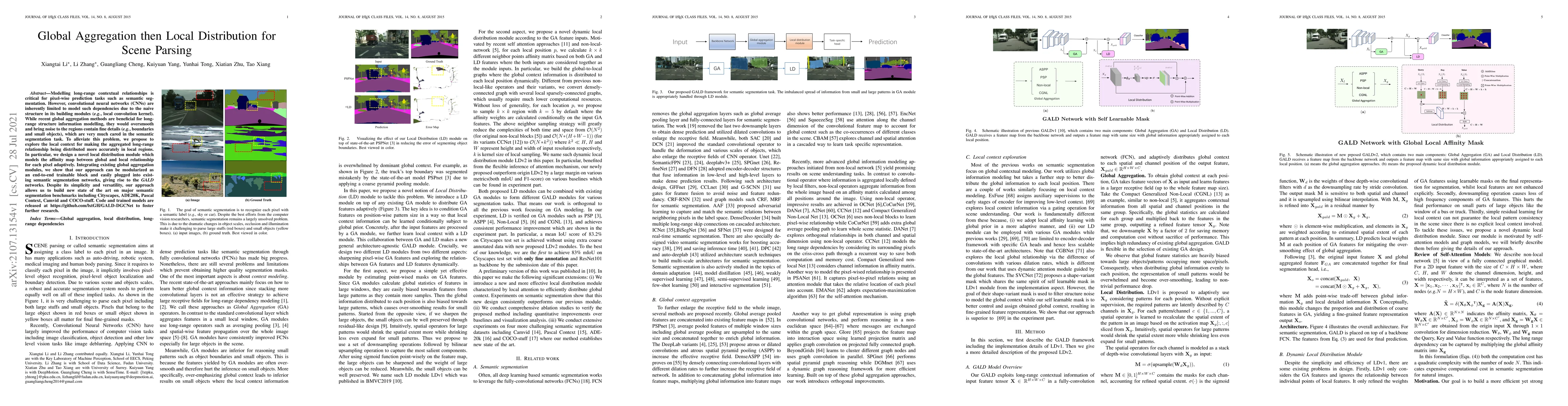 Modelling long-range contextual relationships is critical for pixel-wise prediction tasks such as semantic segmentation. However, convolutional neural networks (CNNs) are inherently limited to model such dependencies due to the naive structure in its building modules (\eg, local convolution kernel). While recent global aggregation methods are beneficial for long-range structure information modelling, they would oversmooth and bring noise to the regions containing fine details (\eg,~boundaries and small objects), which are very much cared for the semantic segmentation task. To alleviate this problem, we propose to explore the local context for making the aggregated long-range relationship being distributed more accurately in local regions. In particular, we design a novel local distribution module which models the affinity map between global and local relationship for each pixel adaptively. Integrating existing global aggregation modules, we show that our approach can be modularized as an end-to-end trainable block and easily plugged into existing semantic segmentation networks, giving rise to the \emph{GALD} networks. Despite its simplicity and versatility, our approach allows us to build new state of the art on major semantic segmentation benchmarks including Cityscapes, ADE20K, Pascal Context, Camvid and COCO-stuff. Code and trained models are released at \url{https://github.com/lxtGH/GALD-DGCNet} to foster further research.