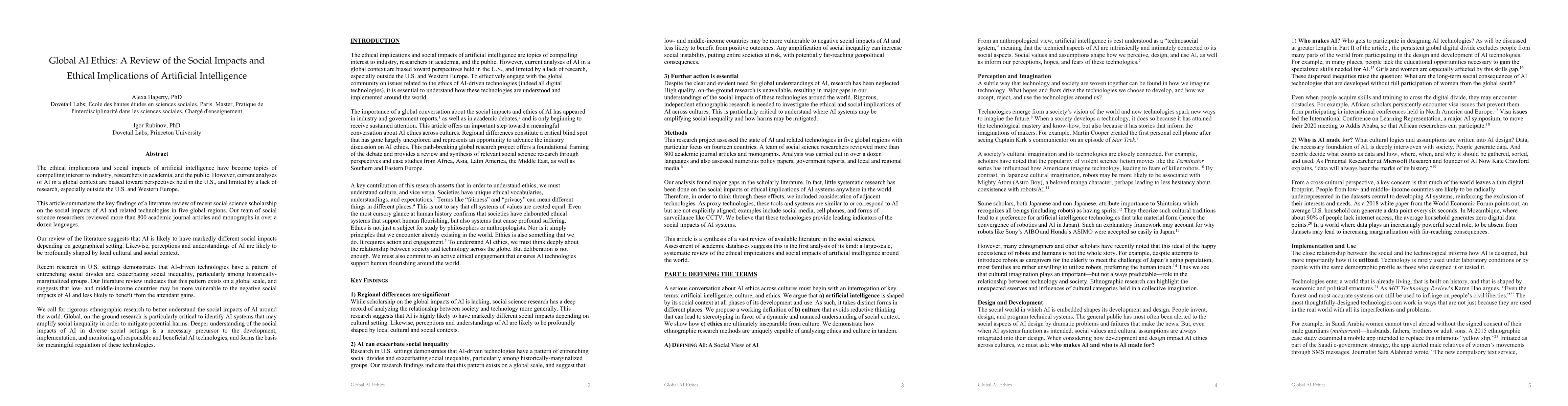 This paper reviews global social science literature on AI's ethical implications and social impacts, highlighting that AI's effects vary significantly by region and are deeply influenced by local cultural contexts. It emphasizes the need for more ethnographic research to understand and mitigate AI's potential to exacerbate social inequality, especially in low- and middle-income countries.