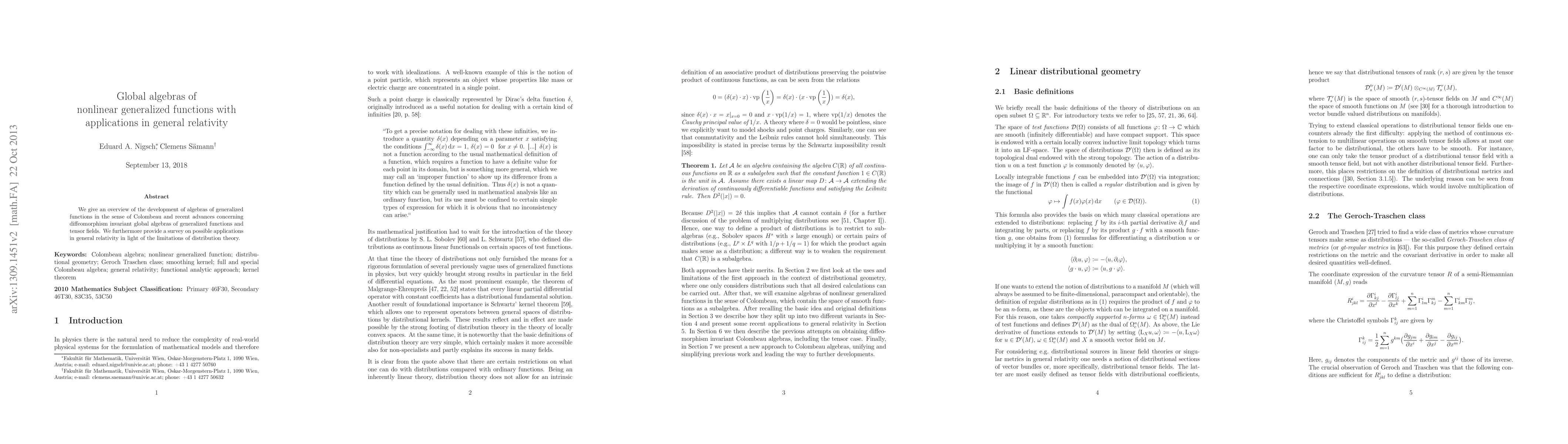 We give an overview of the development of algebras of generalized functions in the sense of Colombeau and recent advances concerning diffeomorphism invariant global algebras of generalized functions and tensor fields. We furthermore provide a survey on possible applications in general relativity in light of the limitations of distribution theory.