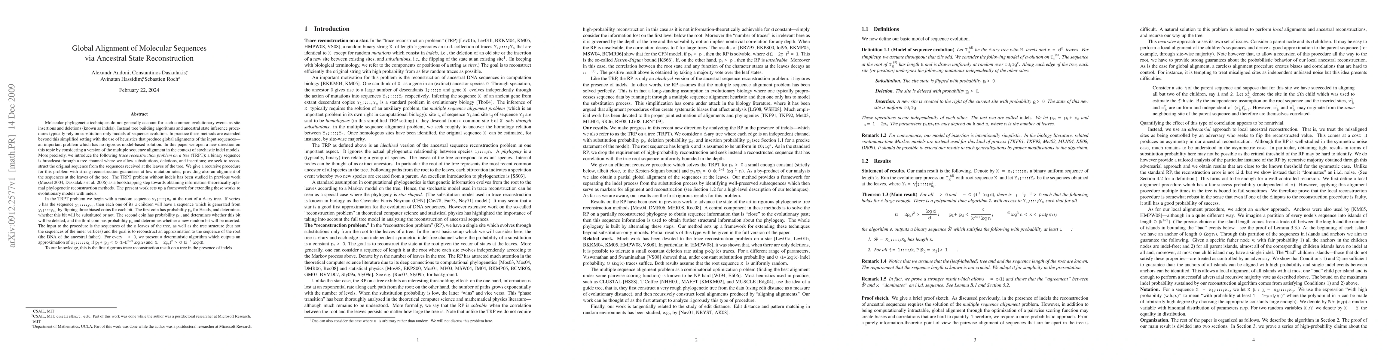 This paper introduces a new method for global alignment of molecular sequences by incorporating indels through a trace reconstruction problem on a tree, providing a recursive procedure with strong reconstruction guarantees at low mutation rates and a framework for extending optimal phylogenetic reconstruction methods to include indels.