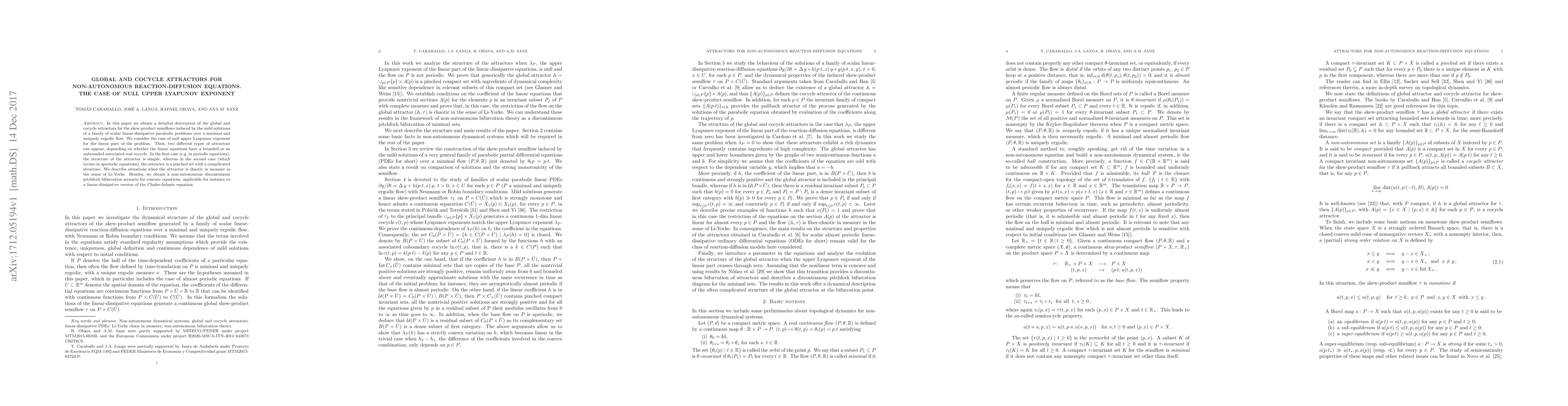 In this paper we obtain a detailed description of the global and cocycle attractors for the skew-product semiflows induced by the mild solutions of a family of scalar linear-dissipative parabolic problems over a minimal and uniquely ergodic flow. We consider the case of null upper Lyapunov exponent for the linear part of the problem. Then, two different types of attractors can appear, depending on whether the linear equations have a bounded or an unbounded associated real cocycle. In the first case (e.g.~in periodic equations), the structure of the attractor is simple, whereas in the second case (which occurs in aperiodic equations), the attractor is a pinched set with a complicated structure. We describe situations when the attractor is chaotic in measure in the sense of Li-Yorke. Besides, we obtain a non-autonomous discontinuous pitchfork bifurcation scenario for concave equations, applicable for instance to a linear-dissipative version of the Chafee-Infante equation.