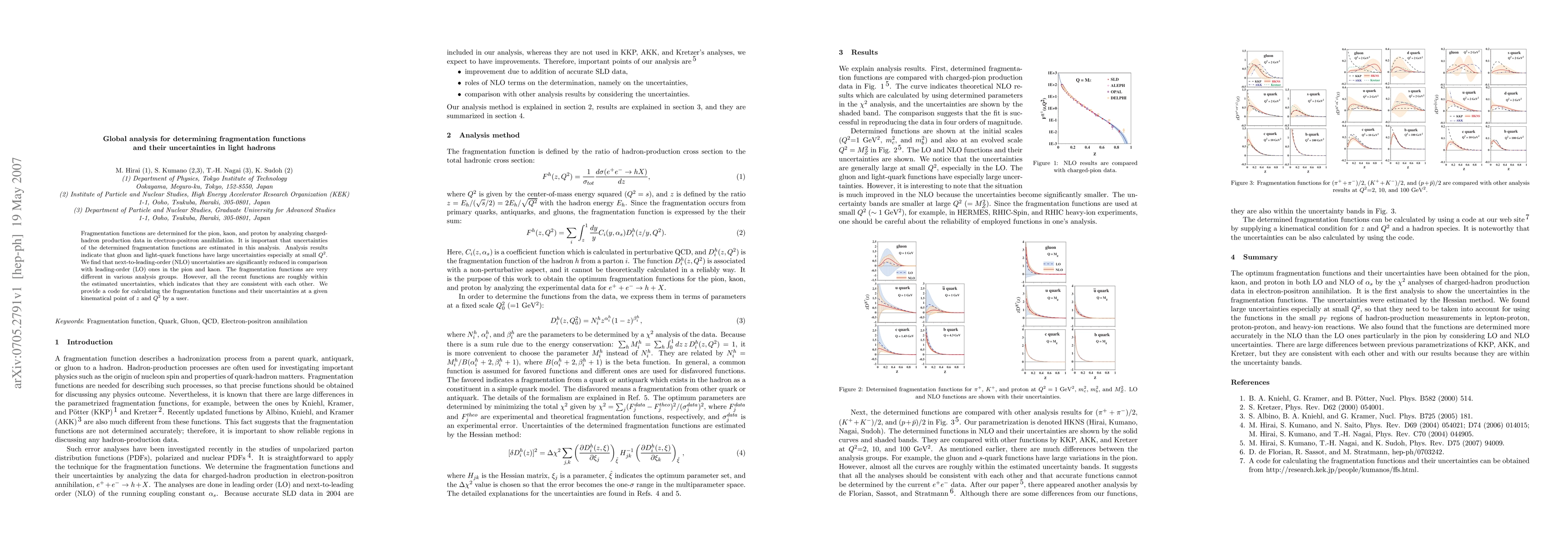 This paper determines fragmentation functions for pions, kaons, and protons using electron-positron annihilation data, highlighting significant uncertainties in gluon and light-quark functions at small Q^2. Next-to-leading-order calculations reduce uncertainties compared to leading-order ones, and despite differences among various analysis groups, recent functions remain consistent within estimated uncertainties.