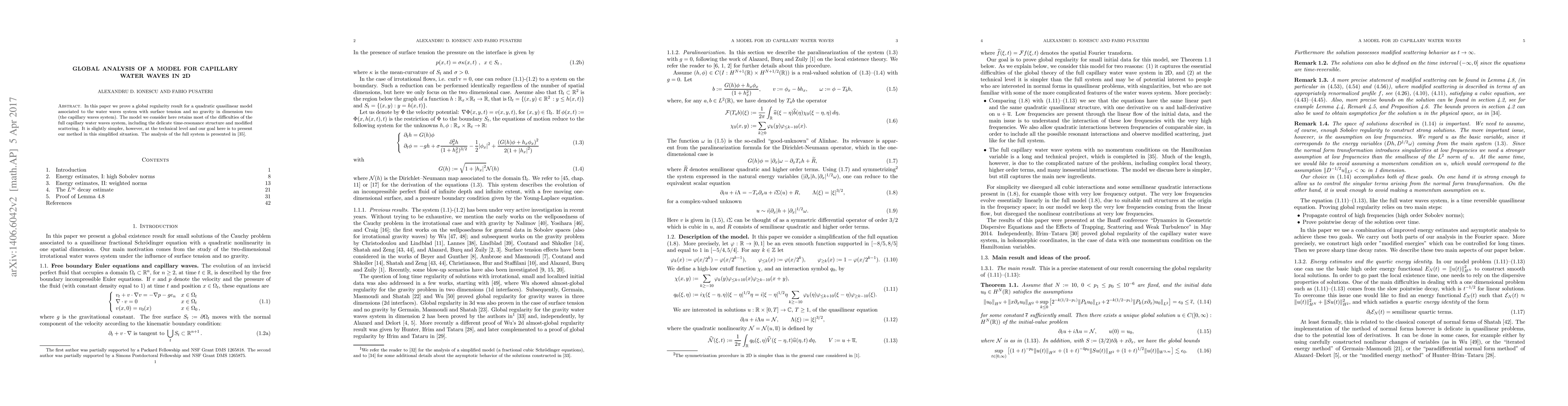 The paper presents a detailed method for proving global regularity in a simplified model of capillary water waves, contributing to the mathematical understanding of such systems.