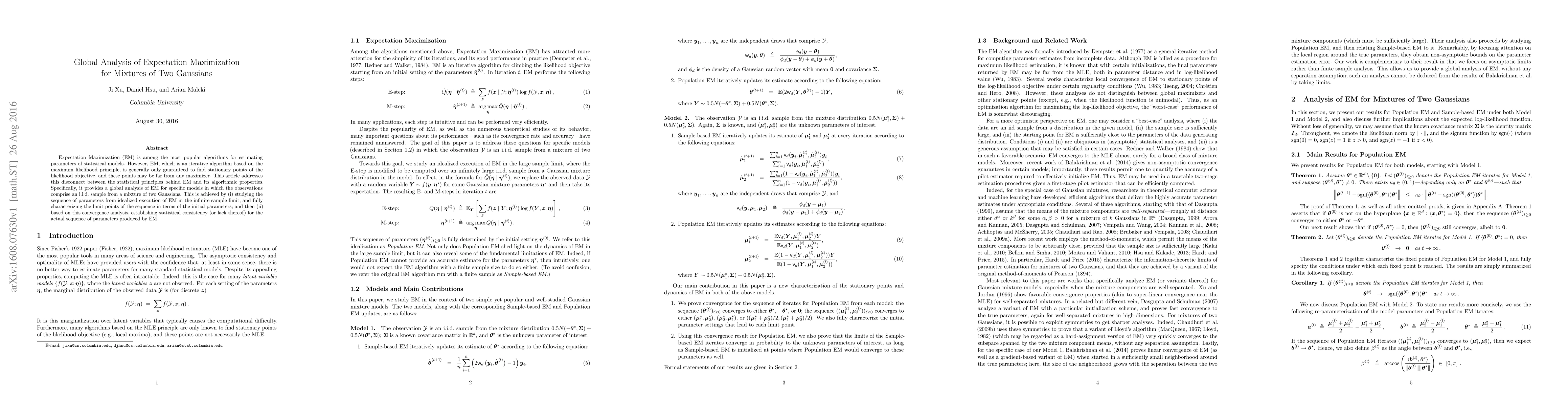 Expectation Maximization (EM) is among the most popular algorithms for estimating parameters of statistical models. However, EM, which is an iterative algorithm based on the maximum likelihood principle, is generally only guaranteed to find stationary points of the likelihood objective, and these points may be far from any maximizer. This article addresses this disconnect between the statistical principles behind EM and its algorithmic properties. Specifically, it provides a global analysis of EM for specific models in which the observations comprise an i.i.d. sample from a mixture of two Gaussians. This is achieved by (i) studying the sequence of parameters from idealized execution of EM in the infinite sample limit, and fully characterizing the limit points of the sequence in terms of the initial parameters; and then (ii) based on this convergence analysis, establishing statistical consistency (or lack thereof) for the actual sequence of parameters produced by EM.