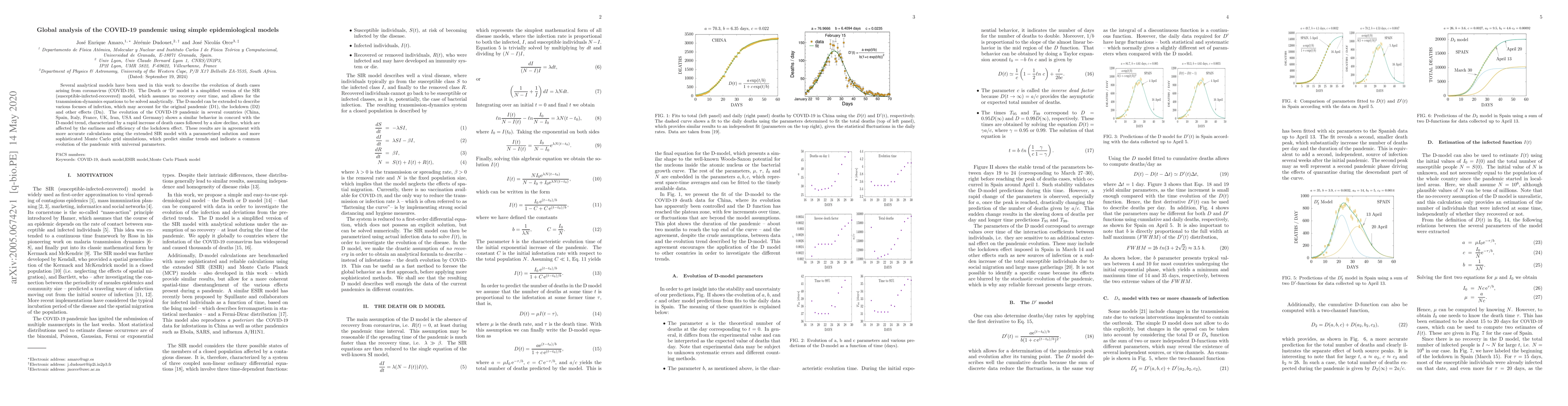 Several analytical models have been used in this work to describe the evolution of death cases arising from coronavirus (COVID-19). The Death or `D' model is a simplified version of the SIR (susceptible-infected-recovered) model, which assumes no recovery over time, and allows for the transmission-dynamics equations to be solved analytically. The D-model can be extended to describe various focuses of infection, which may account for the original pandemic (D1), the lockdown (D2) and other effects (Dn). The evolution of the COVID-19 pandemic in several countries (China, Spain, Italy, France, UK, Iran, USA and Germany) shows a similar behavior in concord with the D-model trend, characterized by a rapid increase of death cases followed by a slow decline, which are affected by the earliness and efficiency of the lockdown effect. These results are in agreement with more accurate calculations using the extended SIR model with a parametrized solution and more sophisticated Monte Carlo grid simulations, which predict similar trends and indicate a common evolution of the pandemic with universal parameters.
