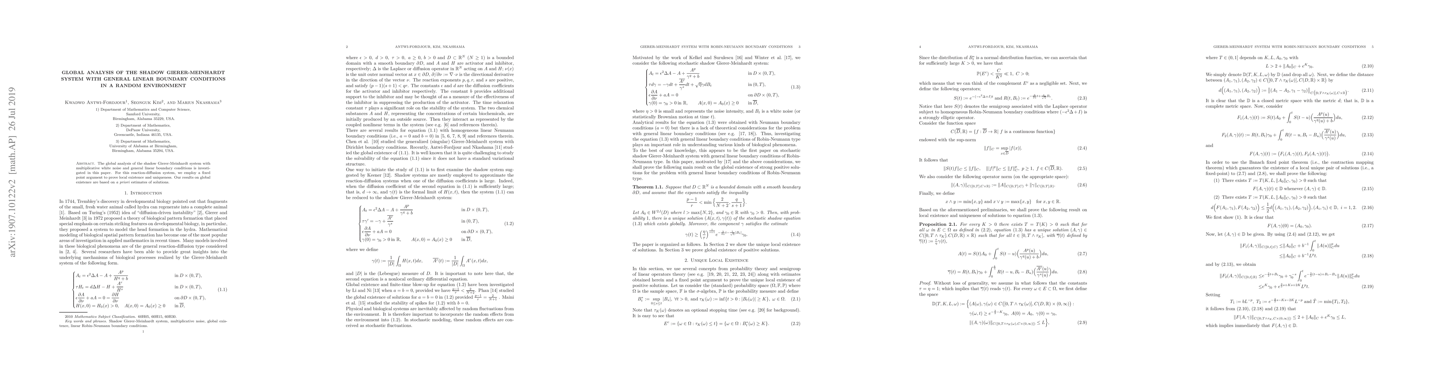 This paper investigates the global analysis of the shadow Gierer-Meinhardt system under multiplicative white noise and general linear boundary conditions. It employs a fixed point argument to establish local existence and uniqueness, and uses a priori estimates to prove global existence.