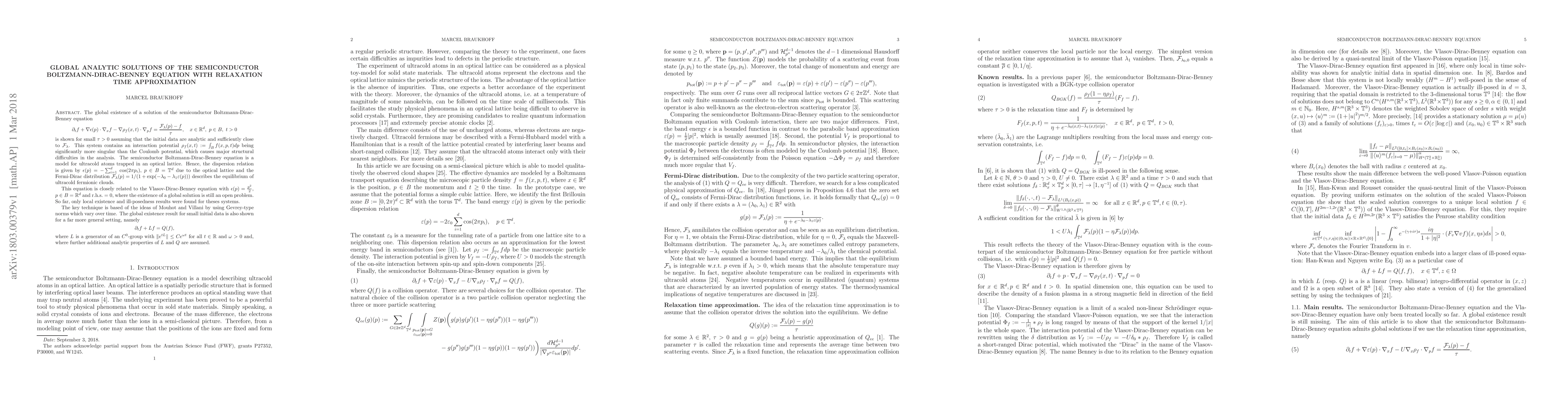 The global existence of a solution of the semiconductor Boltzmann-Dirac-Benney equation \[ \partial_t f + \nabla\epsilon(p)\cdot\nabla_x f - \nabla \rho_f(x,t)\cdot\nabla_p f = \frac{\mathcal F_\lambda(p)-f}\tau, \quad x\in\mathbb{R}^d,\ p\in B, \ t>0 \] is shown for small $\tau>0$ assuming that the initial data are analytic and sufficiently close to $\mathcal F_\lambda$. This system contains an interaction potential $\rho_f(x,t):=\int_{B}f(x,p,t)dp$ being significantly more singular than the Coulomb potential, which causes major structural difficulties in the analysis. The semiconductor Boltzmann-Dirac-Benney equation is a model for ultracold atoms trapped in an optical lattice. Hence, the dispersion relation is given by $\epsilon(p) = -\sum_{i=1}^d$ $\cos(2\pi p_i)$, $p\in B=\mathbb{T}^d$ due to the optical lattice and the Fermi-Dirac distribution $\mathcal F_\lambda(p)=1/(1+\exp(-\lambda_0-\lambda_1\epsilon(p)))$ describes the equilibrium of ultracold fermionic clouds. This equation is closely related to the Vlasov-Dirac-Benney equation with $\epsilon(p)=\frac{p^2}2$, $p\in B=\mathbb R^d$ and r.h.s$.=0$, where the existence of a global solution is still an open problem. So far, only local existence and ill-posedness results were found for theses systems. The key technique is based of the ideas of Mouhot and Villani by using Gevrey-type norms which vary over time. The global existence result for small initial data is also shown for a far more general setting, namely \[\partial_t f + Lf=Q(f),\] where $L$ is a generator of an $C^0$-group with $\|e^{tL}\|\leq Ce^{\omega t}$ for all $t\in\mathbb R$ and $\omega>0$ and, where further additional analytic properties of $L$ and $Q$ are assumed.