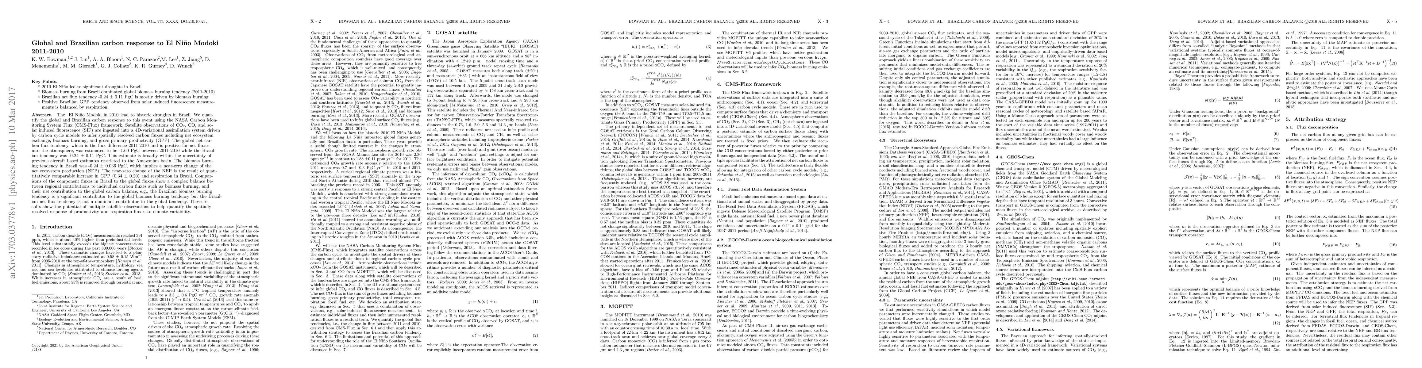 The El Ni\~{n}o Modoki in 2010 lead to historic droughts in Brazil. We quantify the global and Brazilian carbon response to this event using the NASA Carbon Monitoring System Flux (CMS-Flux) framework. Satellite observations of CO$_2$, CO, and solar induced fluorescence (SIF) are ingested into a 4D-variational assimilation system driven by carbon cycle models to infer spatially resolved carbon fluxes including net ecosystem exchange, biomass burning, and gross primary productivity (GPP). The global net carbon flux tendency, which is the flux difference 2011-2010 and is positive for net fluxes into the atmosphere, was estimated to be -1.60 PgC between 2011-2010 while the Brazilian tendency was -0.24 $\pm$ 0.11 PgC. This estimate is broadly within the uncertainty of previous aircraft based estimates restricted to the Amazonian basin. The biomass burning tendency in Brazil was -0.24 $\pm$ 0.036 PgC, which implies a near-zero change of the net ecosystem production (NEP). The near-zero change of the NEP is the result of quantitatively comparable increase in GPP (0.34 $\pm$ 0.20) and respiration in Brazil. Comparisons of the component fluxes in Brazil to the global fluxes show a complex balance between regional contributions to individual carbon fluxes such as biomass burning, and their net contribution to the global carbon balance, i.e., the Brazilian biomass burning tendency is a significant contributor to the global biomass burning tendency but the Brazilian net flux tendency is not a dominant contributor to the global tendency. These results show the potential of multiple satellite observations to help quantify the spatially resolved response of productivity and respiration fluxes to climate variability.