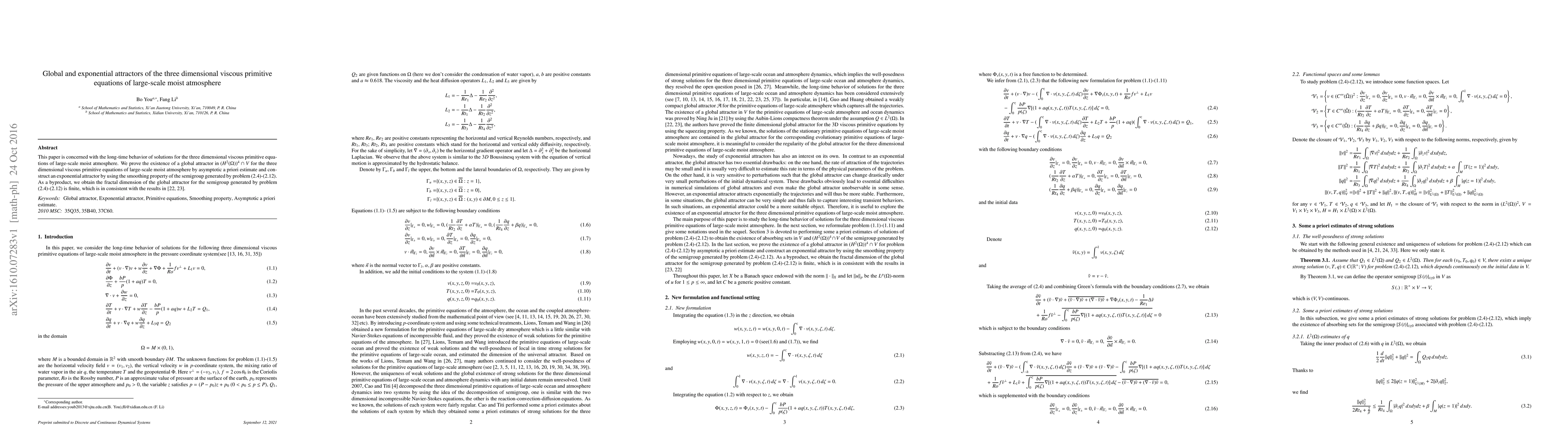 This paper proves the existence of a global attractor and constructs an exponential attractor for the three-dimensional viscous primitive equations governing large-scale moist atmosphere dynamics. It also determines the finite fractal dimension of the global attractor, consistent with prior studies.