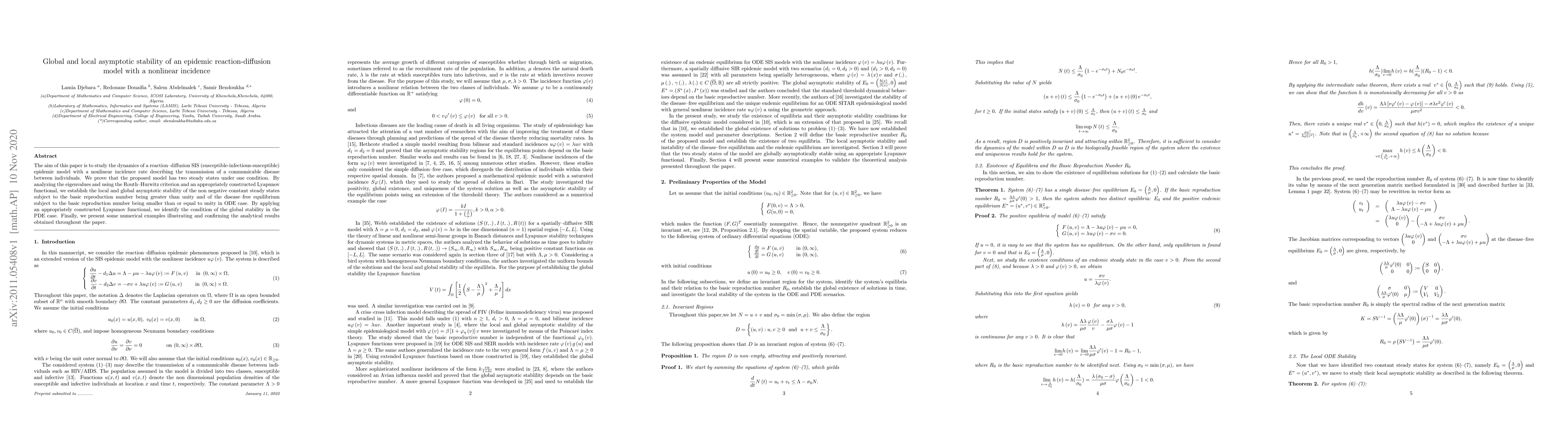 This paper investigates the dynamics of a reaction-diffusion SIS epidemic model with a nonlinear incidence rate, proving local and global asymptotic stability conditions under specific basic reproduction number thresholds. Analytical results are confirmed through numerical examples.