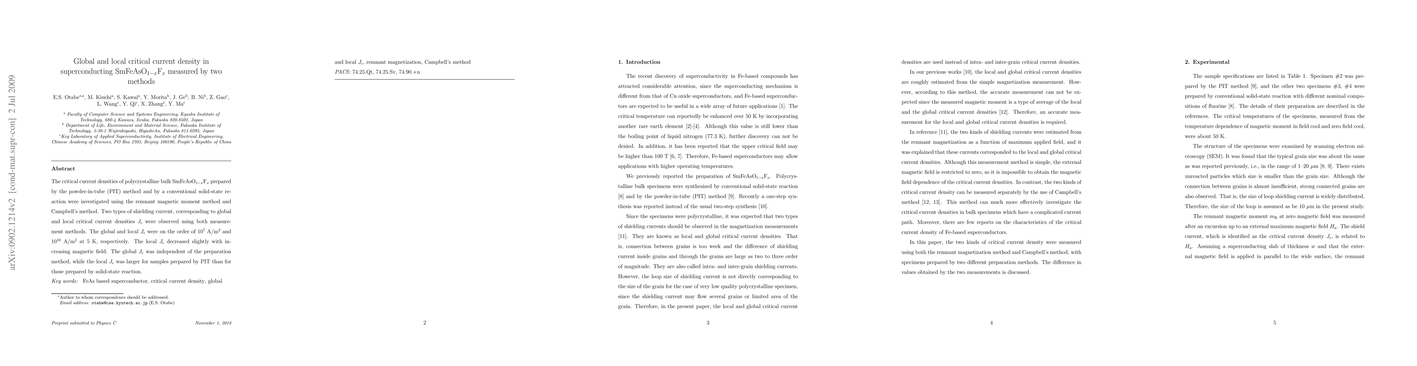 The critical current densities of polycrystalline bulk SmFeAsO$_{1-x}$F$_x$ prepared by the powder-in-tube (PIT) method and by a conventional solid-state reaction were investigated using the remnant magnetic moment method and Campbell's method. Two types of shielding current, corresponding to global and local critical current densities $J_{\rm c}$ were observed using both measurement methods. The global and local $J_{\rm c}$ were on the order of $10^7$ A/m$^2$ and $10^{10}$ A/m$^2$ at 5 K, respectively. The local $J_{\rm c}$ decreased slightly with increasing magnetic field. The global $J_{\rm c}$ was independent of the preparation method, while the local $J_{\rm c}$ was larger for samples prepared by PIT than for those prepared by solid-state reaction.