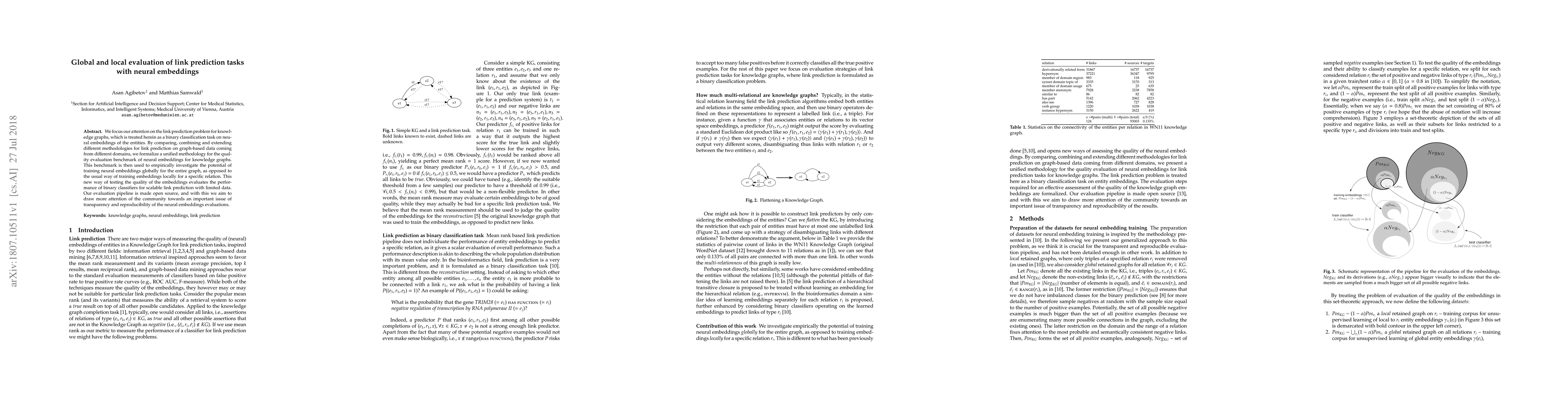We focus our attention on the link prediction problem for knowledge graphs, which is treated herein as a binary classification task on neural embeddings of the entities. By comparing, combining and extending different methodologies for link prediction on graph-based data coming from different domains, we formalize a unified methodology for the quality evaluation benchmark of neural embeddings for knowledge graphs. This benchmark is then used to empirically investigate the potential of training neural embeddings globally for the entire graph, as opposed to the usual way of training embeddings locally for a specific relation. This new way of testing the quality of the embeddings evaluates the performance of binary classifiers for scalable link prediction with limited data. Our evaluation pipeline is made open source, and with this we aim to draw more attention of the community towards an important issue of transparency and reproducibility of the neural embeddings evaluations.