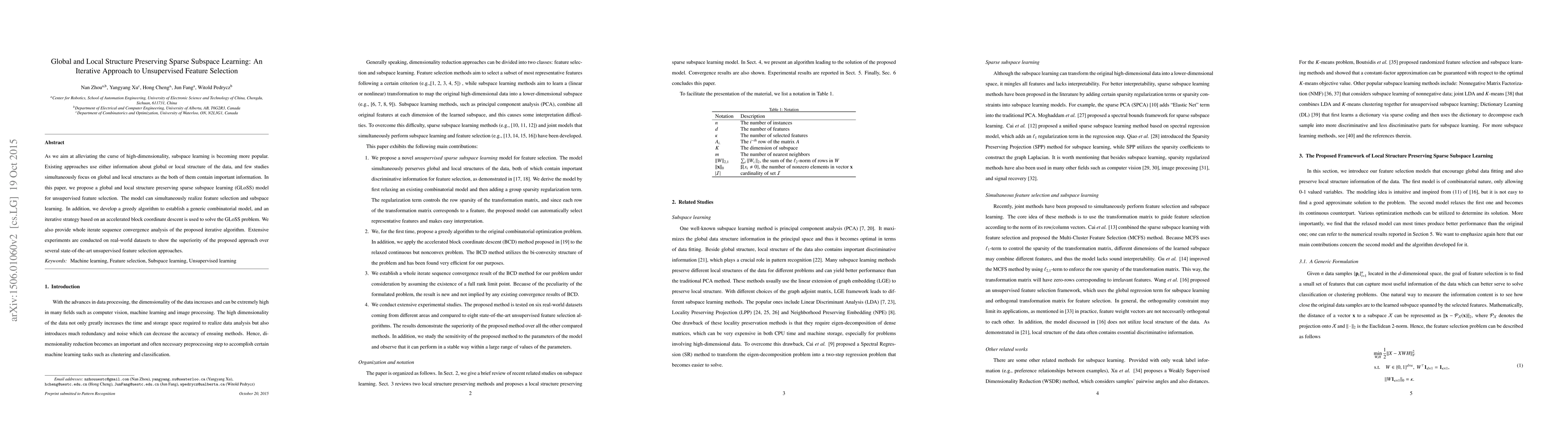 This paper proposes a global and local structure preserving sparse subspace learning (GLoSS) model for unsupervised feature selection, combining both global and local data information for better dimensionality reduction. An iterative algorithm with accelerated block coordinate descent is developed to solve the GLoSS problem, and extensive experiments demonstrate its superiority over existing methods.