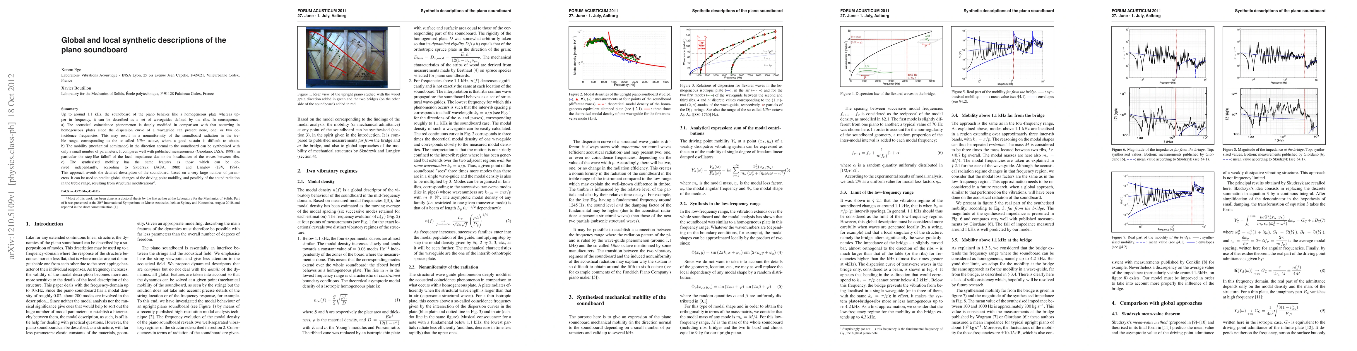Up to around 1.1 kHz, the soundboard of the piano behaves like a homogeneous plate whereas upper in frequency, it can be described as a set of waveguides defined by the ribs. In consequence: a) The acoustical coincidence phenomenon is deeply modified in comparison with that occurring in homogeneous plates since the dispersion curve of a waveguide can present none, one, or two coincidence frequencies. This may result in a nonuniformity of the soundboard radiation in the treble range, corresponding to the so-called killer octave, where a good sustain is difficult to obtain. b) The mobility (mechanical admittance) in the direction normal to the soundboard can be synthesised with only a small number of parameters. It compares well with published measurements (Giordano, JASA, 1998), in particular the step-like falloff of the local impedance due to the localisation of the waves between ribs. c) The synthesised mobility has the same features as those which can be derived independantly, according to Skudrzyk (JASA, 1980) and Langley (JSV, 1994). This approach avoids the detailed description of the soundboard, based on a very large number of parameters. It can be used to predict global changes of the driving point mobility, and possibly of the sound radiation in the treble range, resulting from structural modifications.