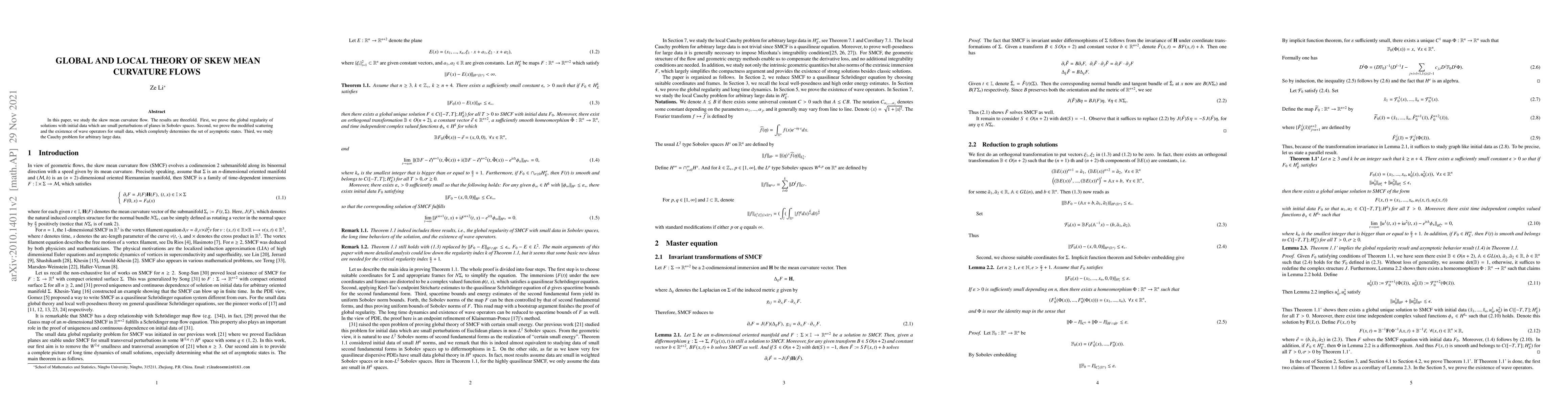 This paper investigates the skew mean curvature flow, establishing global regularity for small perturbations of planes, proving modified scattering and the existence of wave operators for small data, and examining the Cauchy problem for large initial data.