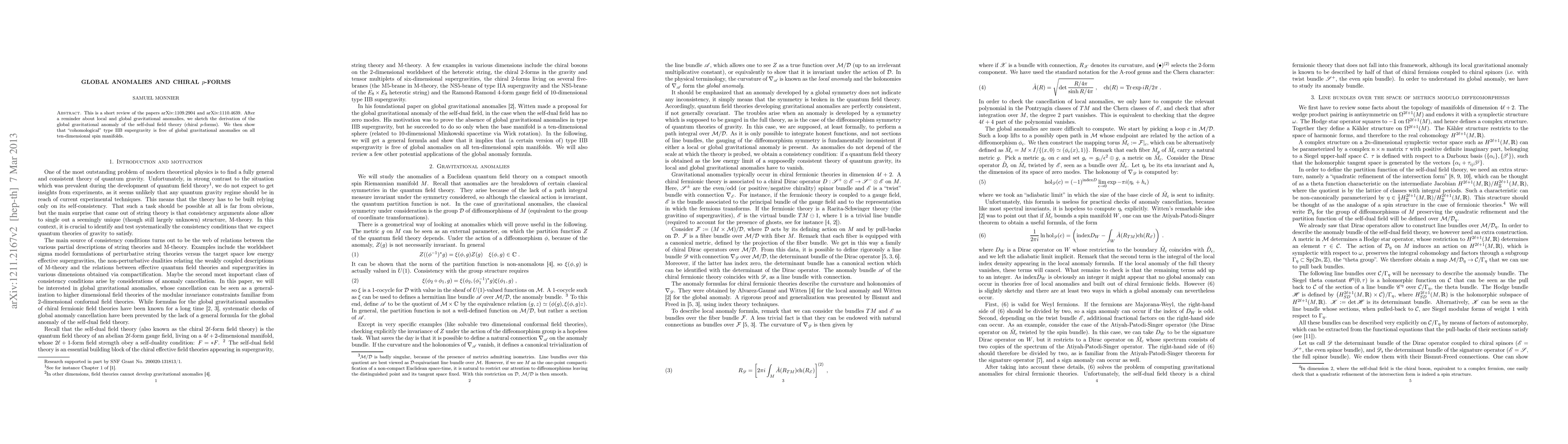 This is a short review of the papers arXiv:1109.2904 and arXiv:1110.4639. After a reminder about local and global gravitational anomalies, we sketch the derivation of the global gravitational anomaly of the self-dual field theory (also known as chiral p-form). We then show that "cohomological" type IIB supergravity is free of global gravitational anomalies on all ten-dimensional spin manifolds