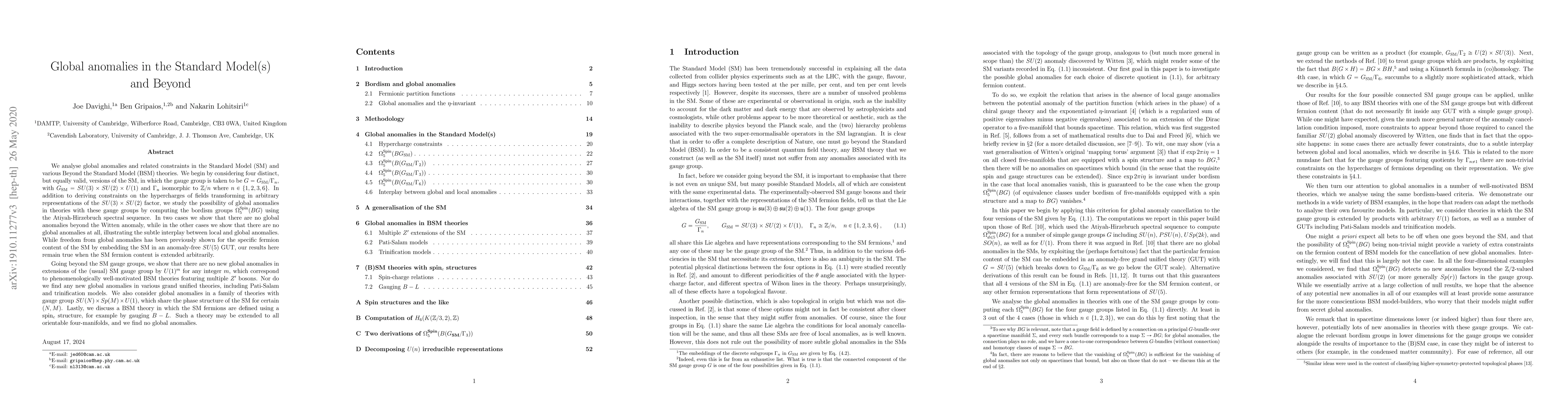 We analyse global anomalies and related constraints in the Standard Model (SM) and various Beyond the Standard Model (BSM) theories. We begin by considering four distinct, but equally valid, versions of the SM, in which the gauge group is taken to be $G=G_{\text{SM}}/\Gamma_n$, with $G_{\text{SM}}=SU(3)\times SU(2) \times U(1)$ and $\Gamma_n$ isomorphic to $\mathbb{Z}/n$ where $n\in\left\{1,2,3,6\right\}$. In addition to deriving constraints on the hypercharges of fields transforming in arbitrary representations of the $SU(3)\times SU(2)$ factor, we study the possibility of global anomalies in theories with these gauge groups by computing the bordism groups $\Omega^{\text{Spin}}_5(BG)$ using the Atiyah-Hirzebruch spectral sequence. In two cases we show that there are no global anomalies beyond the Witten anomaly, while in the other cases we show that there are no global anomalies at all, illustrating the subtle interplay between local and global anomalies. While freedom from global anomalies has been previously shown for the specific fermion content of the SM by embedding the SM in an anomaly-free $SU(5)$ GUT, our results here remain true when the SM fermion content is extended arbitrarily. Going beyond the SM gauge groups, we show that there are no new global anomalies in extensions of the (usual) SM gauge group by $U(1)^m$ for any integer $m$, which correspond to phenomenologically well-motivated BSM theories featuring multiple $Z^\prime$ bosons. Nor do we find any new global anomalies in various grand unified theories, including Pati-Salam and trinification models. We also consider global anomalies in a family of theories with gauge group $SU(N)\times Sp(M)\times U(1)$, which share the phase structure of the SM for certain $(N, M)$.