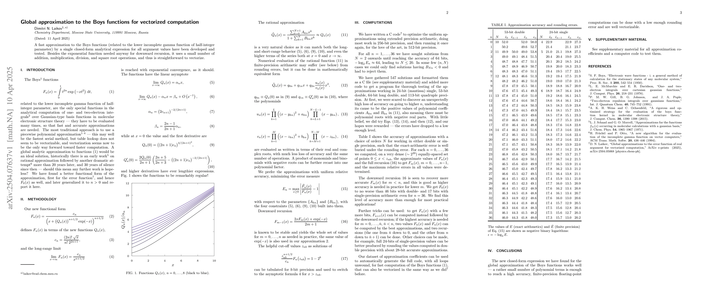 The paper presents a novel global analytic approximation to Boys functions using a single closed-form expression, which is straightforward to vectorize and uses minimal arithmetic operations.