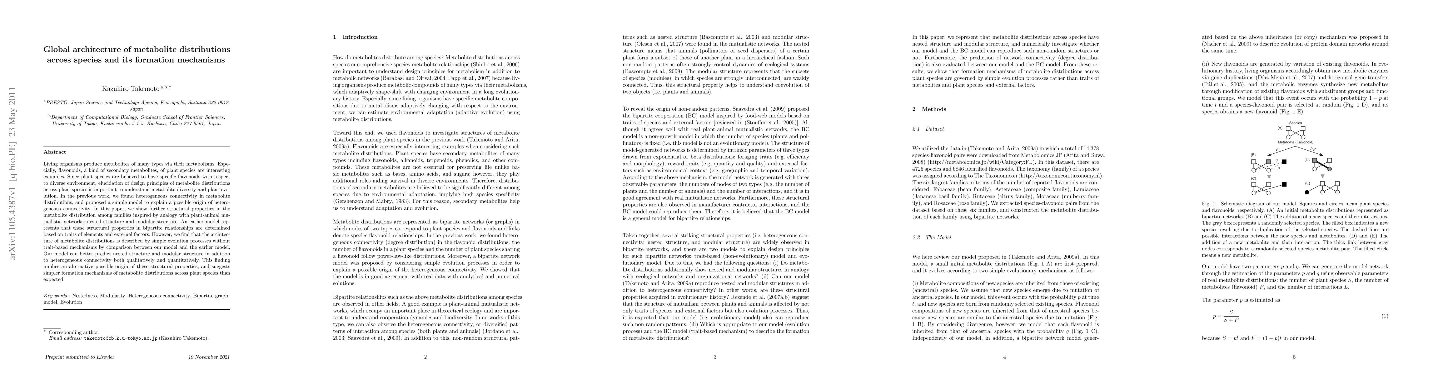 Living organisms produce metabolites of many types via their metabolisms. Especially, flavonoids, a kind of secondary metabolites, of plant species are interesting examples. Since plant species are believed to have specific flavonoids with respect to diverse environment, elucidation of design principles of metabolite distributions across plant species is important to understand metabolite diversity and plant evolution. In the previous work, we found heterogeneous connectivity in metabolite distributions, and proposed a simple model to explain a possible origin of heterogeneous connectivity. In this paper, we show further structural properties in the metabolite distribution among families inspired by analogy with plant-animal mutualistic networks: nested structure and modular structure. An earlier model represents that these structural properties in bipartite relationships are determined based on traits of elements and external factors. However, we find that the architecture of metabolite distributions is described by simple evolution processes without trait-based mechanisms by comparison between our model and the earlier model. Our model can better predict nested structure and modular structure in addition to heterogeneous connectivity both qualitatively and quantitatively. This finding implies an alternative possible origin of these structural properties, and suggests simpler formation mechanisms of metabolite distributions across plant species than expected.