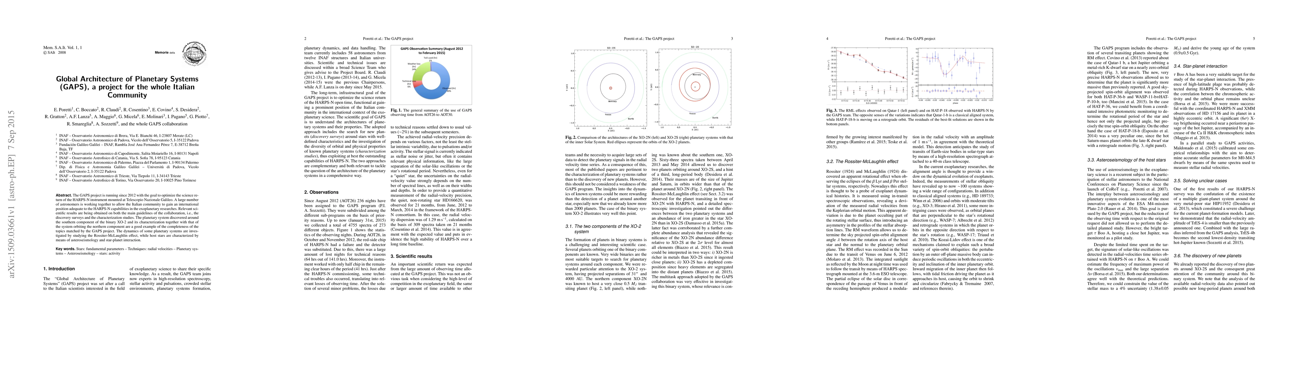 The GAPS project, initiated in 2012, aims to maximize the scientific output of the HARPS-N instrument in exoplanet research, fostering collaboration among Italian astronomers to enhance the country's international standing. Key research includes the discovery and characterization of planetary systems around the binary star XO-2, and investigations into planetary dynamics and star-planet interactions.