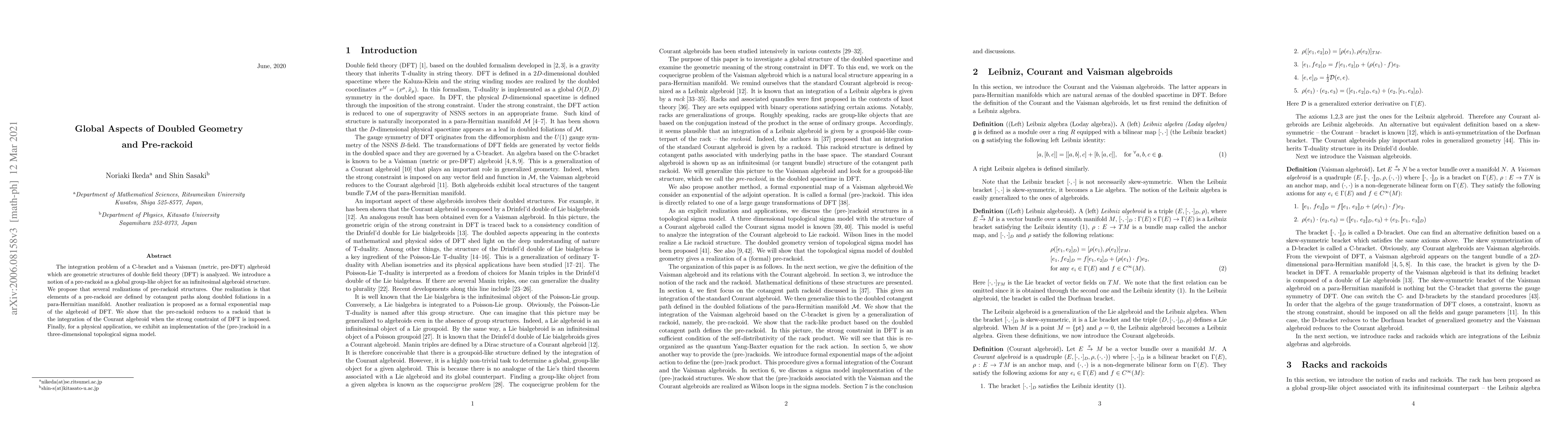 This paper explores the integration problem of a C-bracket and a Vaisman algebroid within double field theory, introducing the concept of a pre-rackoid as a global group-like object for infinitesimal algebroid structures. It demonstrates that pre-rackoids reduce to rackoids under the DFT strong constraint and applies this framework in a three-dimensional topological sigma model.