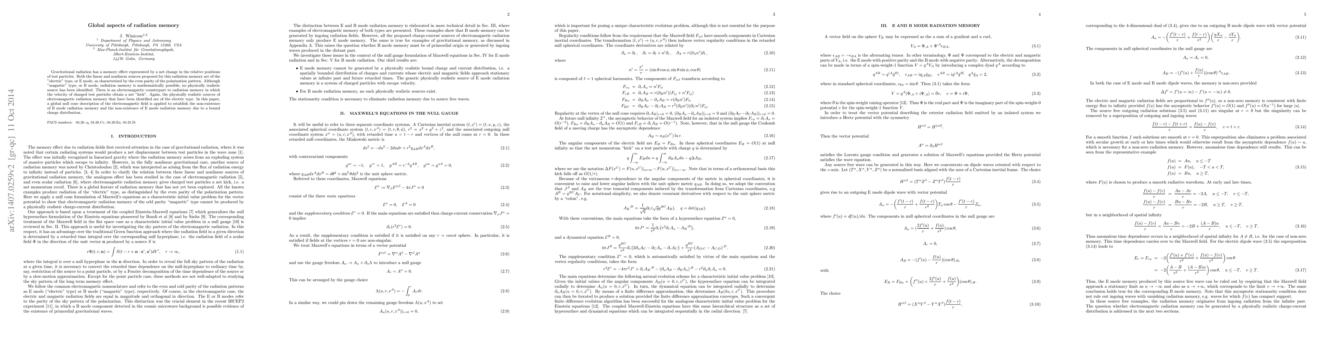 Gravitational radiation has a memory effect represented by a net change in the relative positions of test particles. Both the linear and nonlinear sources proposed for this radiation memory are of the "electric" type, or E mode, as characterized by the even parity of the polarization pattern. Although "magnetic" type, or B mode, radiation memory is mathematically possible, no physically realistic source has been identified. There is an electromagnetic counterpart to radiation memory in which the velocity of charged particles obtain a net "kick". Again, the physically realistic sources of electromagnetic radiation memory that have been identified are of the electric type. In this paper, a global null cone description of the electromagnetic field is applied to establish the non-existence of B mode radiation memory and the non-existence of E mode radiation memory due to a bound charge distribution.