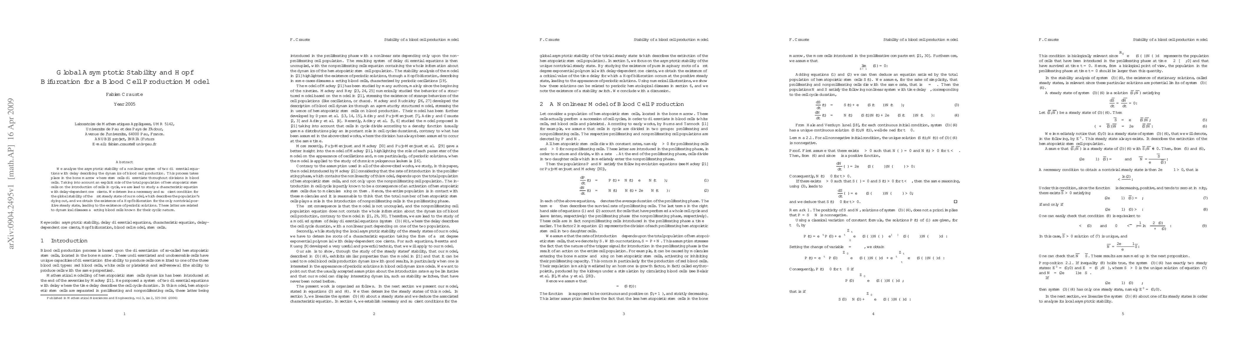 This paper investigates the global asymptotic stability and Hopf bifurcation in a delayed differential equation model for blood cell production dynamics. It establishes conditions for global stability and identifies periodic solutions linked to cyclic blood cell diseases.
