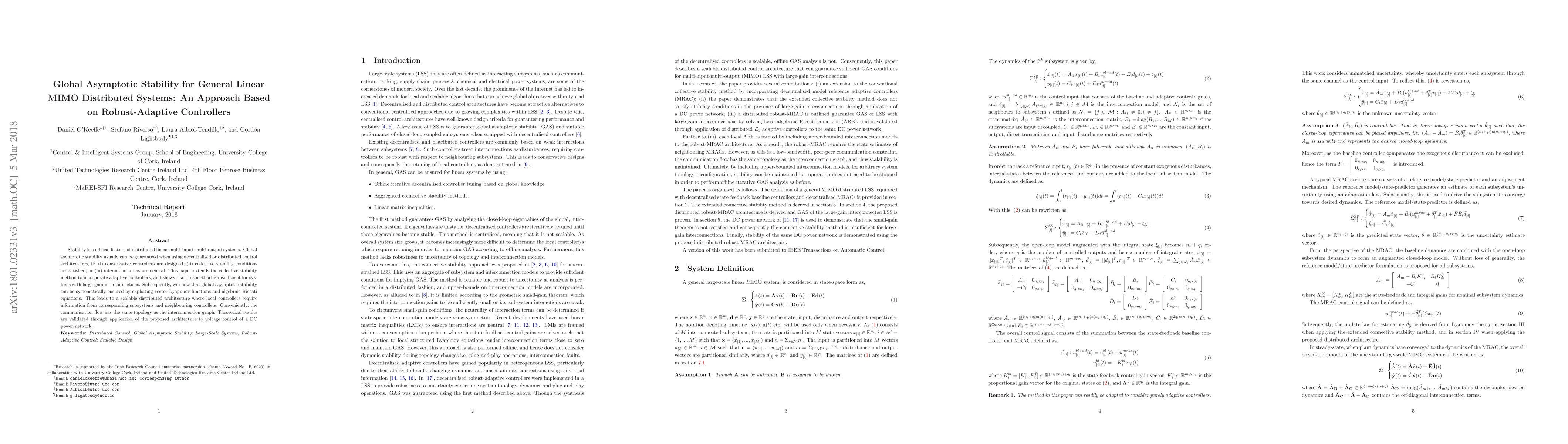 This paper proposes a robust-adaptive control method for global asymptotic stability in distributed linear MIMO systems, extending collective stability with adaptive controllers. It introduces vector Lyapunov functions and algebraic Riccati equations to ensure stability, demonstrating scalability and validating the approach through a DC power network voltage control application.