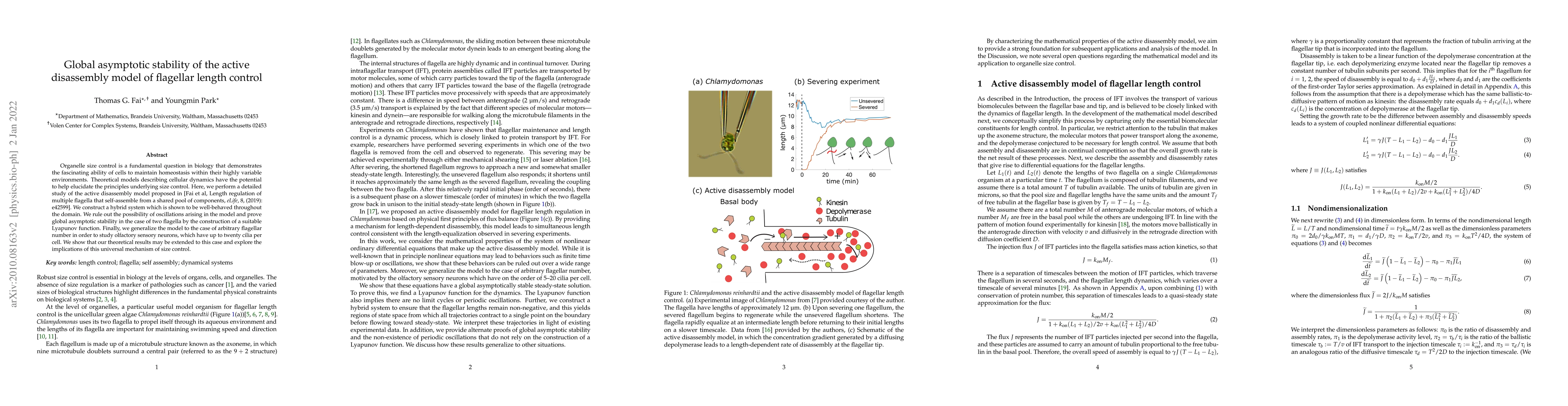 This paper investigates the global asymptotic stability of an active disassembly model for flagellar length control, proving it for two flagella and extending the results to cells with up to twenty cilia, demonstrating a universal mechanism for organelle size control in variable environments.