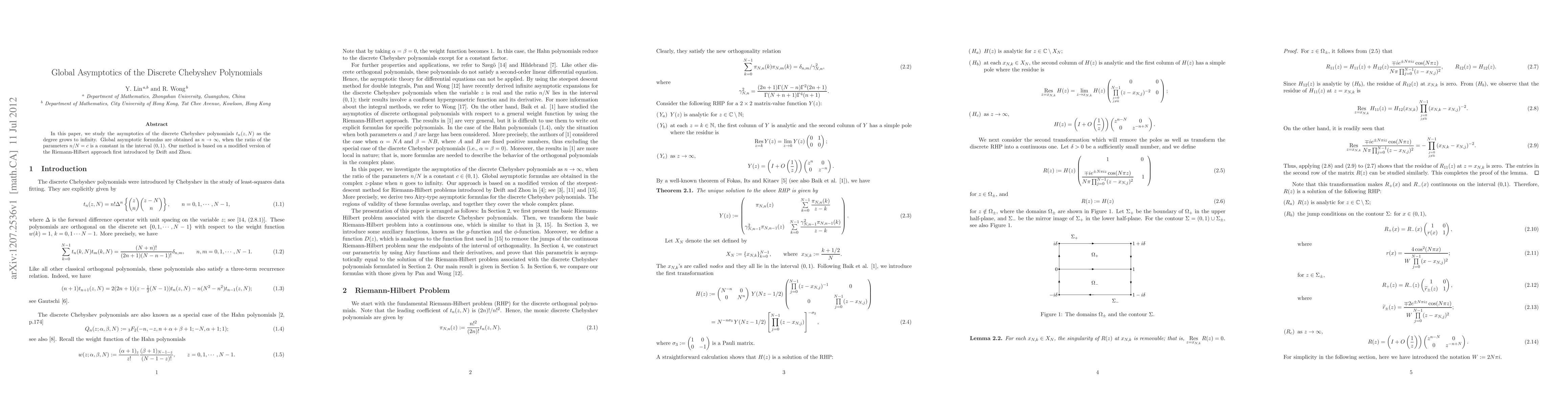This paper investigates the asymptotic behavior of discrete Chebyshev polynomials as their degree approaches infinity, deriving global asymptotic formulas using a modified Riemann-Hilbert approach when the ratio n/N is a constant in (0, 1). The method builds on the foundational work of Deift and Zhou.
