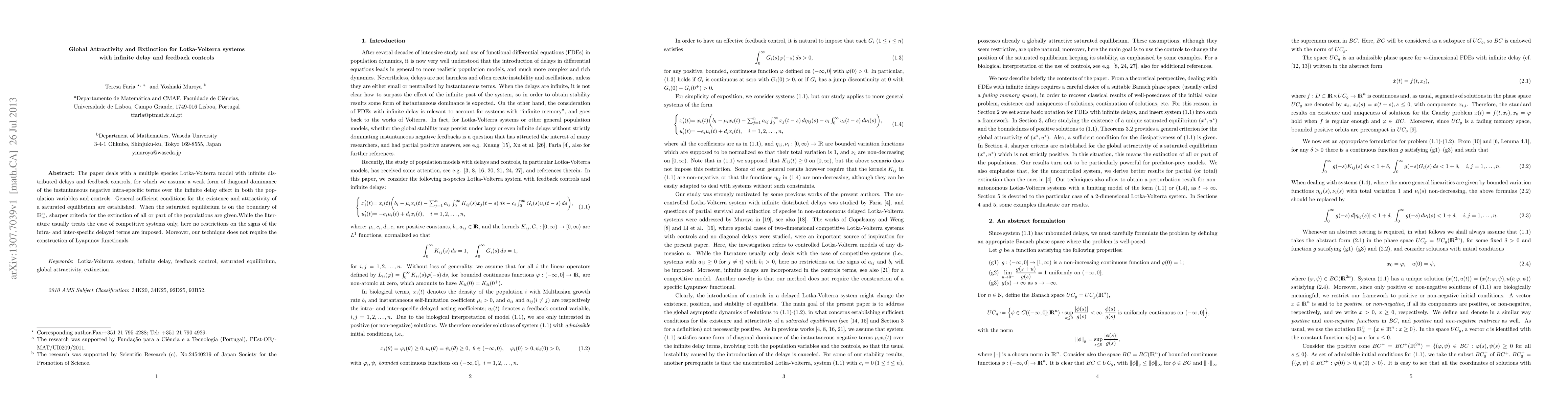 The paper deals with a multiple species Lotka-Volterra model with infinite distributed delays and feedback controls, for which we assume a weak form of diagonal dominance of the instantaneous negative intra-specific terms over the infinite delay effect in both the population variables and controls. General sufficient conditions for the existence and attractivity of a saturated equilibrium are established. When the saturated equilibrium is on the boundary of $\R^n_+$, sharper criteria for the extinction of all or part of the populations are given. While the literature usually treats the case of competitive systems only, here no restrictions on the signs of the intra- and inter-specific delayed terms are imposed. Moreover, our technique does not require the construction of Lyapunov functionals.