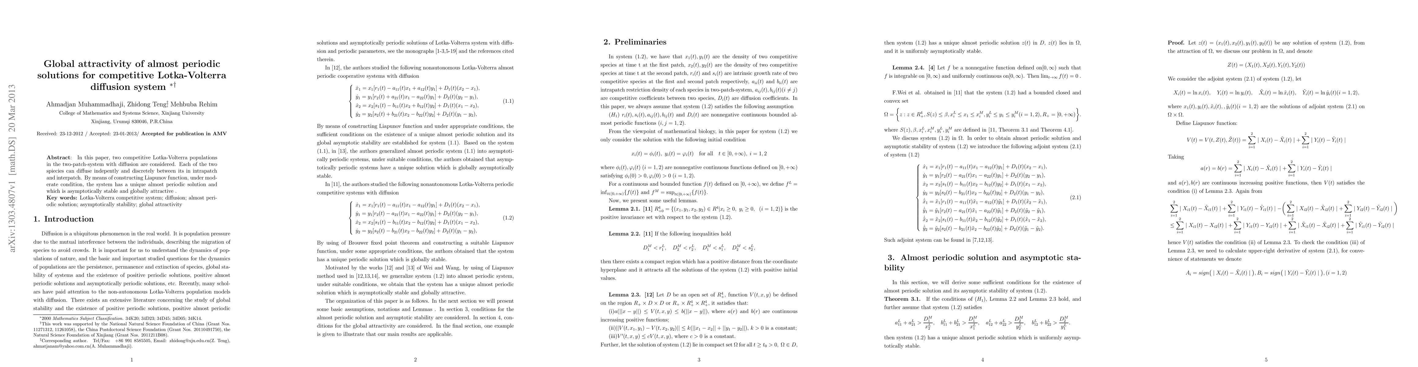 This paper investigates a competitive Lotka-Volterra diffusion system with two species that can independently diffuse between patches. It demonstrates the existence of a unique almost periodic solution that is globally attractive and asymptotically stable under moderate conditions using a constructed Lyapunov function.